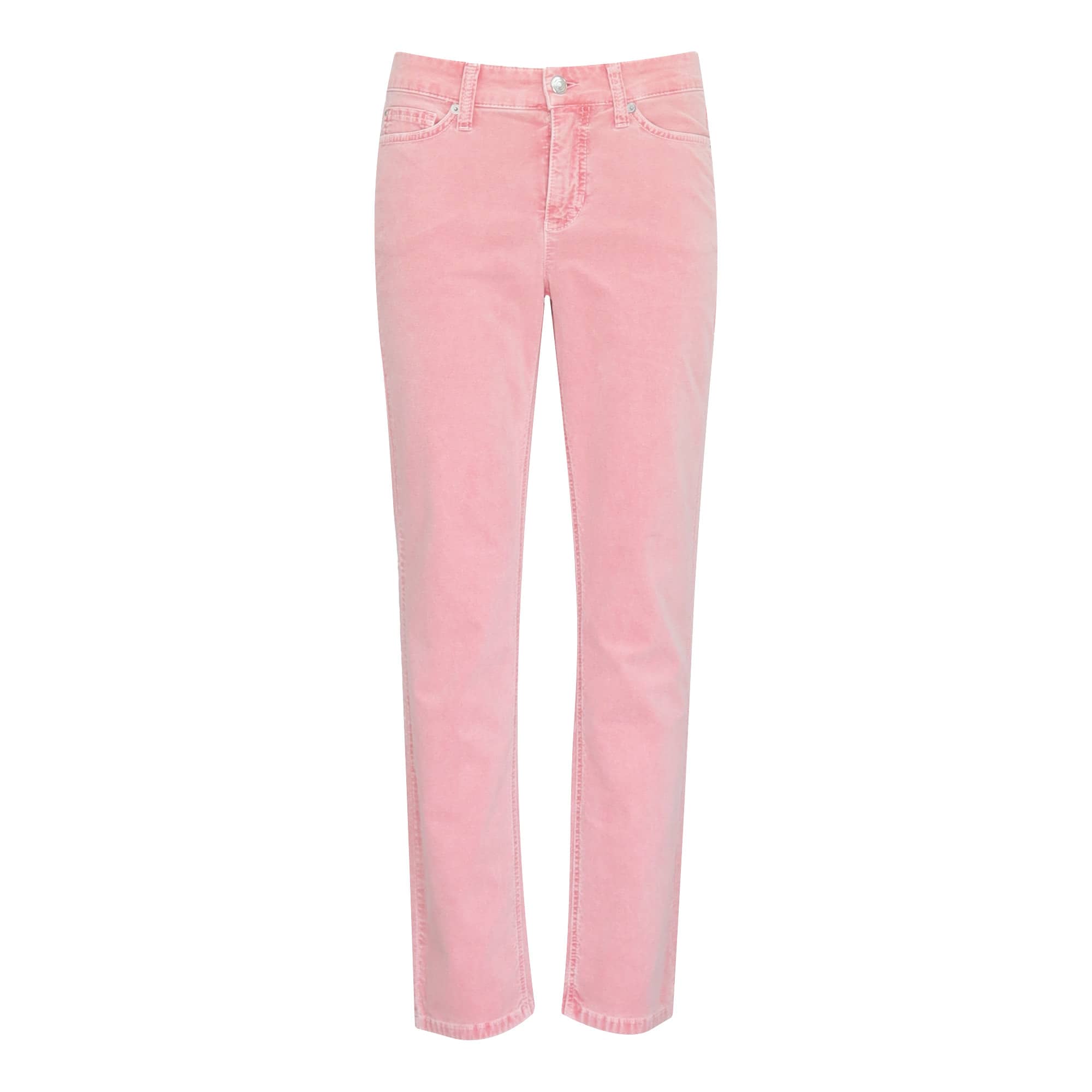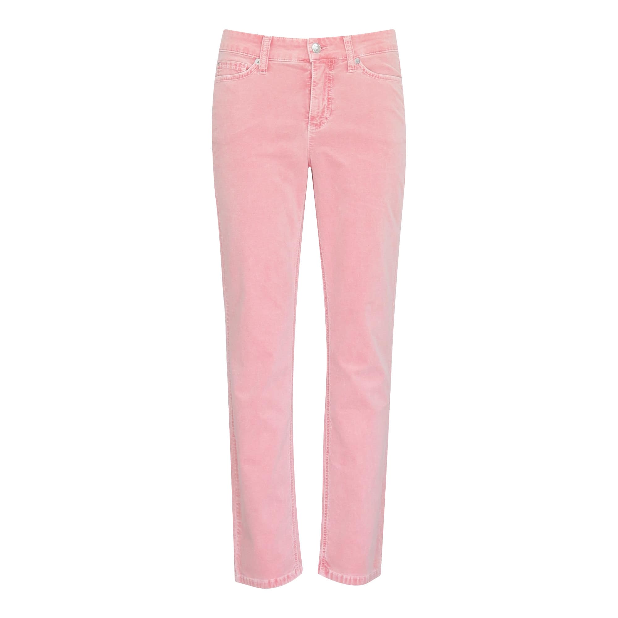 Roze velvet broek van Cambio, model Piper Cropped. Deze fluwelen broek heeft een slim fit pasvorm met een normale taille. De broek valt tot net boven de enkels, sluit met een knoop- en ritssluiting en heeft twee steekzakken en twee achterzakken.