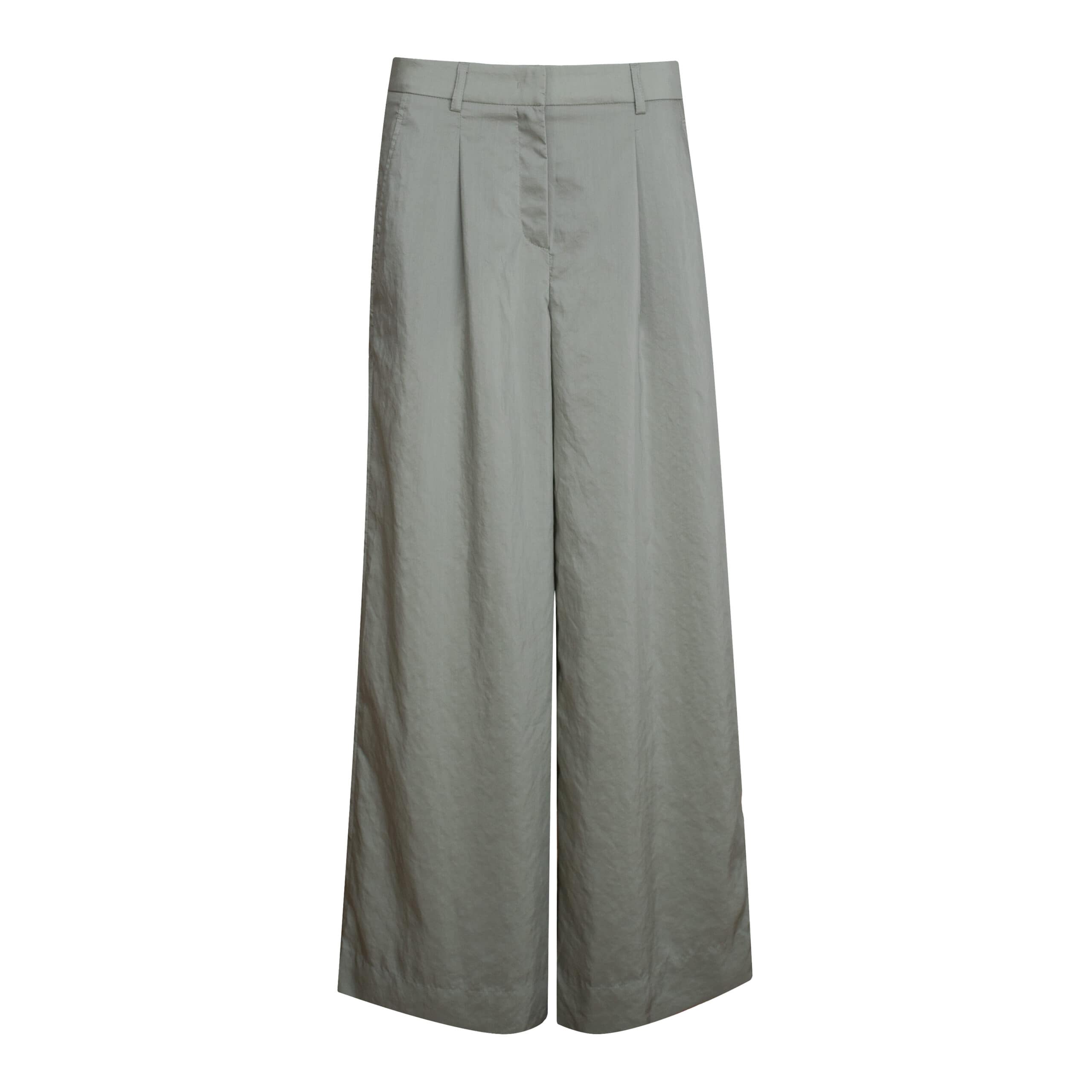 Wijde, satijnen pantalon van Cambio, model Adeline. Deze broek is gemaakt van een effe groene, dunne, satijnen stof en heeft een wijde, losvallende pasvorm. De pantalon sluit met een haakje, knoop- en ritssluiting, wijde broekspijpen, een hogere taille, twee steekzakken en sier paspelzakje.
