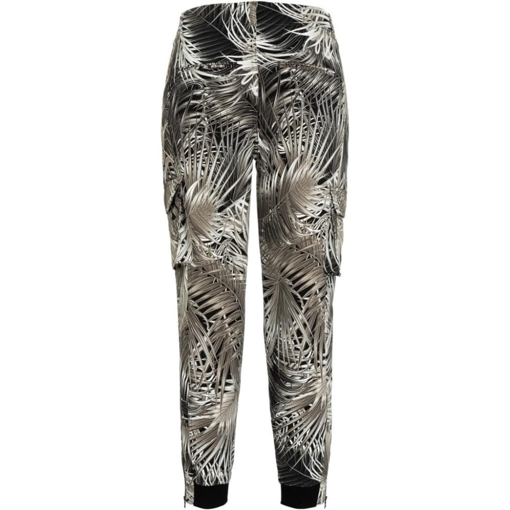 Relaxte jogging broek van Cambio Sport, model Jules. Deze pantalon heeft aan beide broekspijpen cargo zakken en twee sier paspel zakken aan de achterzijde. De broek is gemaakt van een soepelvallende stretch stof met een print van palm bladeren en sluit met een knoop- en ritssluiting.