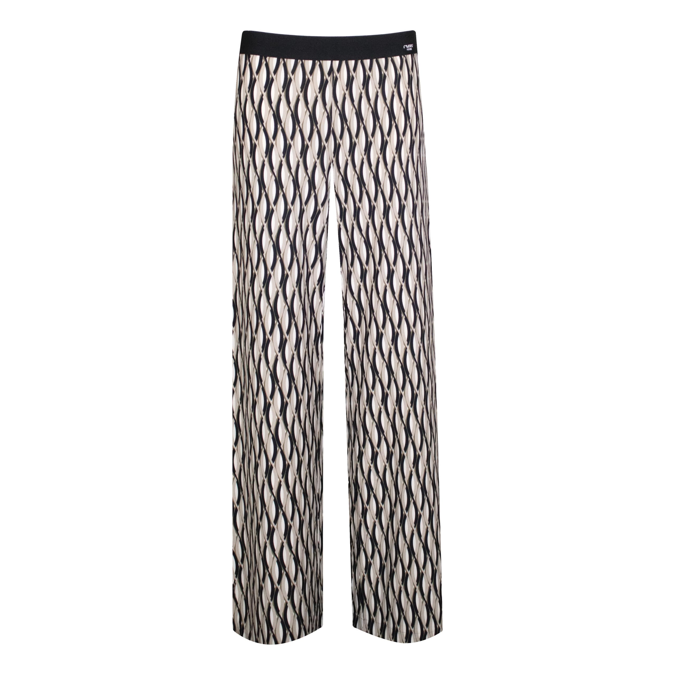 Wijde pantalon van Cambio, model Allison. Deze broek is gemaakt van een gladde stretch stof met een golvende print in ecru, beige en zwart. De pantalon heeft een hoge elastische taille en heeft wijde, rechte broekspijpen.