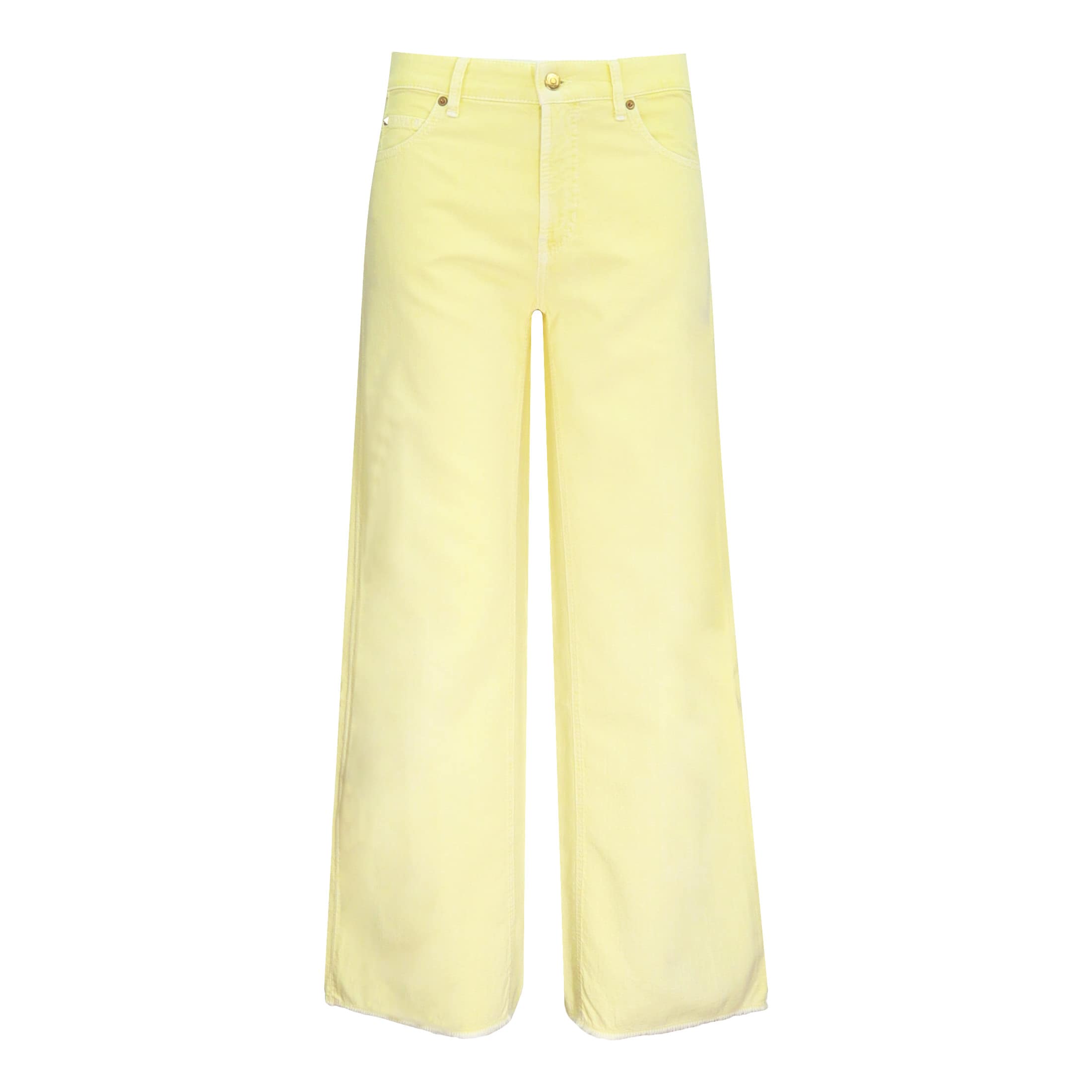 Wijde gele pantalon van Cambio. Deze pantalon is gemaakt van een dunne, katoenen, gele stof en rechte wijde broekspijpen met aan de onderzijde fijne rafels. De culotte broek sluit met een knoop- en ritssluiting, heeft een twee steekzakken en twee achterzakken.