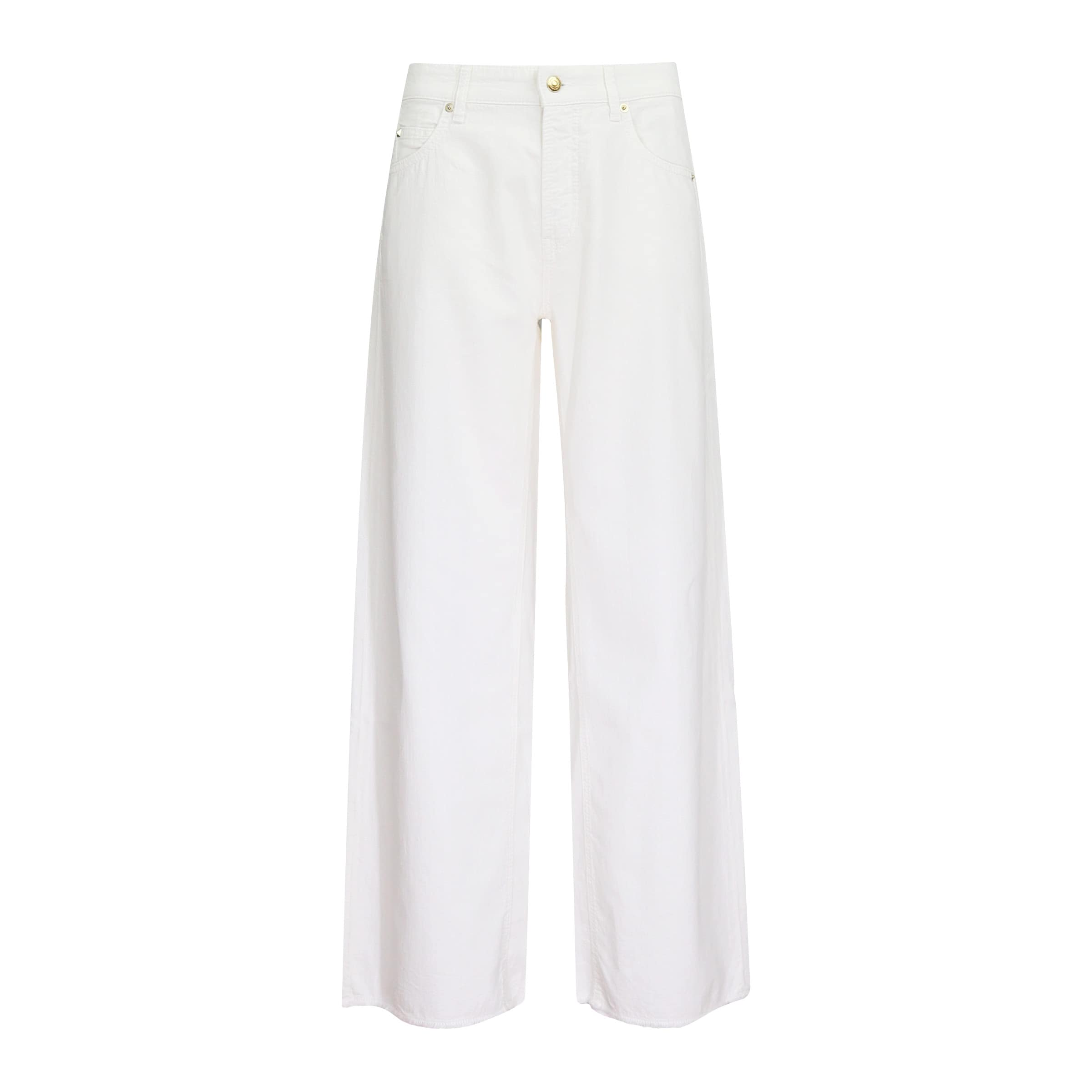 Wijde off white pantalon van Cambio. Deze pantalon is gemaakt van een katoenen off white stof, heeft een hoge taille en rechte, wijde broekspijpen met fijne rafels. De pantalon sluit met een haakje, knoop- en ritssluiting, heeft een twee steekzakken en twee achterzakken.