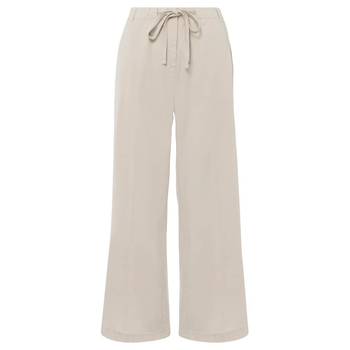 Culotte pantalon van Cambio, model Cecilia. Deze katoenen broek heeft wijde broekspijpen en heeft een elastische taille met een trekkoord. De beige pantalon sluit met een haakje, knoop- en ritssluiting, heeft twee steekzakken en twee sier paspelzakken.
