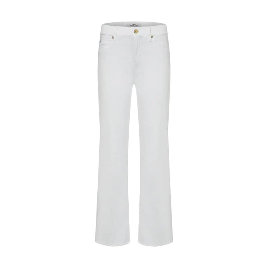 Witte pantalon van Cambio, model Faina in classy white & fringed. Deze broek is gemaakt van witte stretch denim en heeft een slim fit pasvorm met een uitlopende broekspijp. De katoenen broek sluit met een knoop- en ritssluiting, heeft een medium taille en valt tot net boven de enkels met een fijn gerafelde zoom, die aan de binnenkant is ingesprongen.