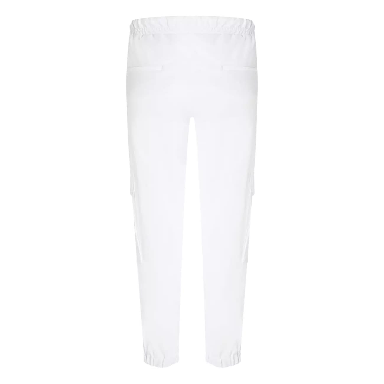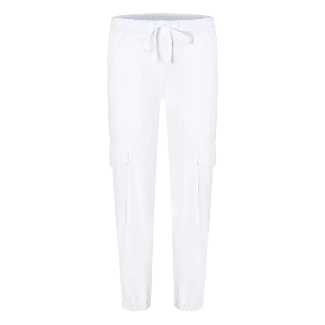 Relaxte broek van Cambio, model Karo Jogg in pure white. Deze pantalon is gemaakt van een witte gladde stretch stof met een elastische taille en elastische zoom. De jogging broek heeft een normale taille, toelopende broekpijpen met twee cargozakken aan de zijkant en twee steekzakken en twee sier paspelzakken.