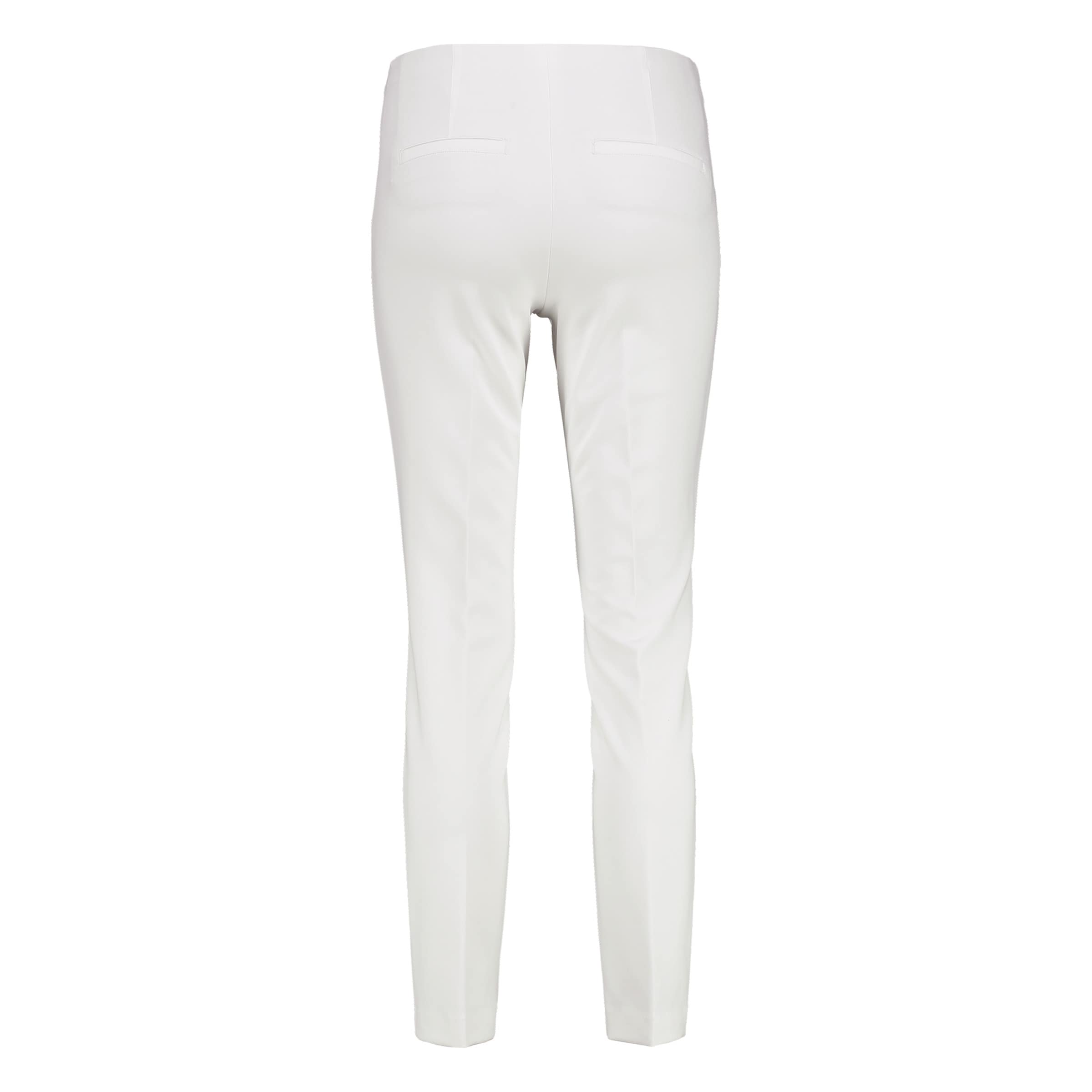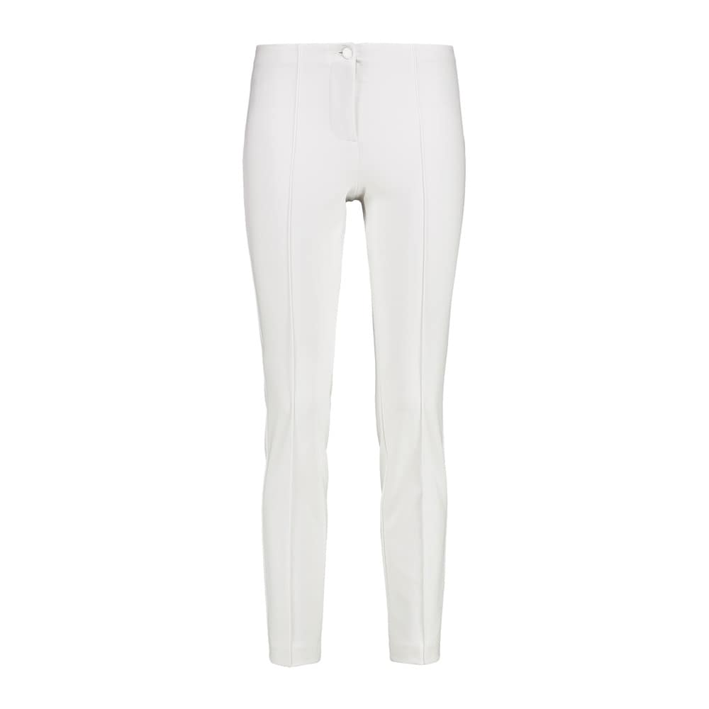 Pantalon van Cambio, model Ros. Deze broek is gemaakt van een witte, gladde stretch stof en sluit met een knoop- en ritssluiting. De pantalon heeft tapstoelopende pijpen met een normale taille, vaste naad aan de voorzijde en twee sier paspelzakjes aan de achterzijde.