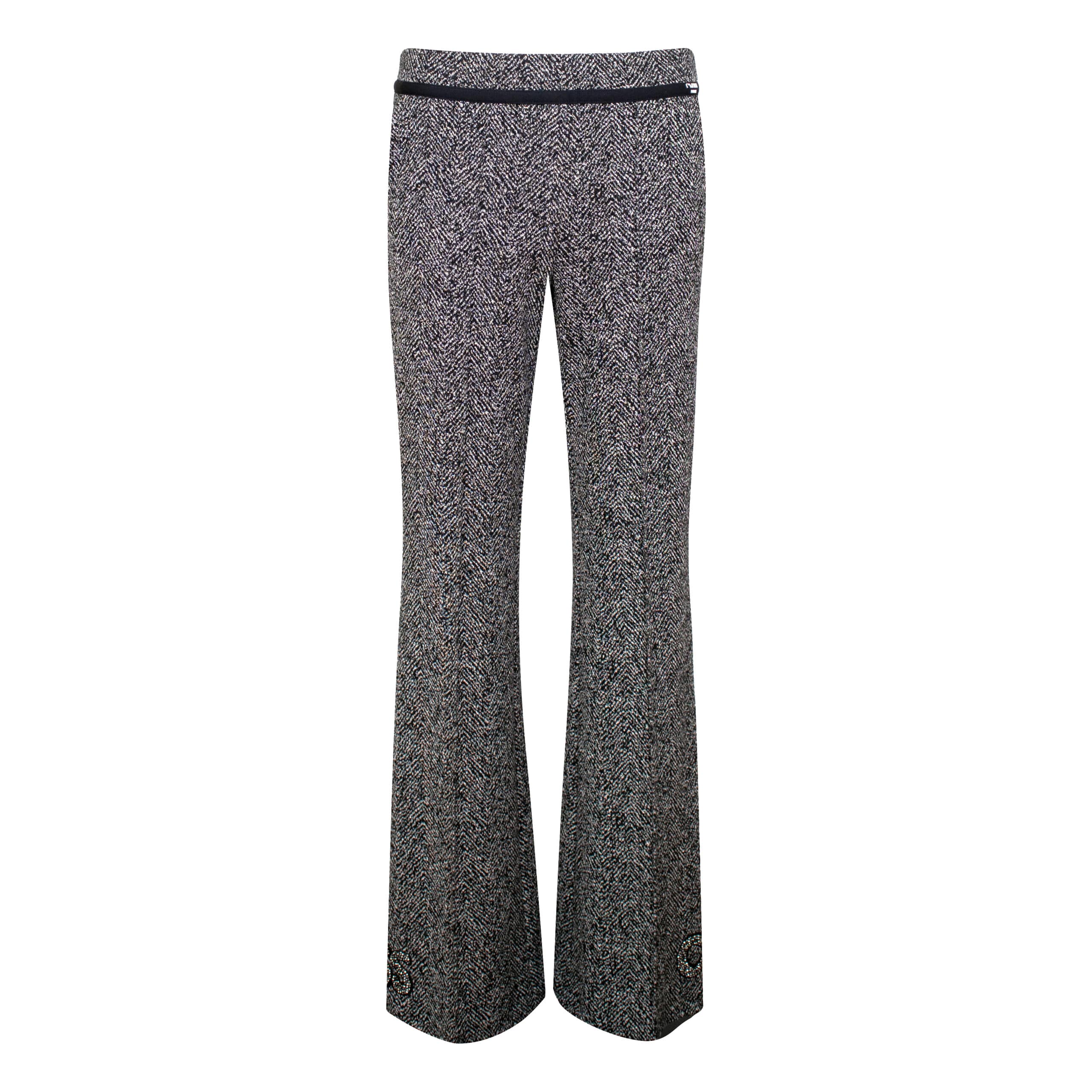 Zwart witte flared pantalon van Cambio, model Francoise. Deze broek is gemaakt van een jersey stretch stof met een zwart, wit zigzag motief, heeft een slim fit pasvorm en flared broekspijpen die aan de onderzijde bezet zijn met steentjes die Miss CMB vormen. De pantalon heeft een elastische taille, twee steekzakken en twee sier paspelzakken.