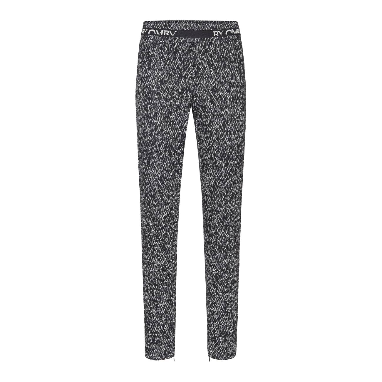 Aansluitende broek van Cambio, model Ranee. Deze broek is gemaakt van jersey stretch stof en heeft een all over zwarte witte print. De broek heeft een elastische tailleband en een vaste naad in de broekspijpen met aan de onderzijde ritsjes.