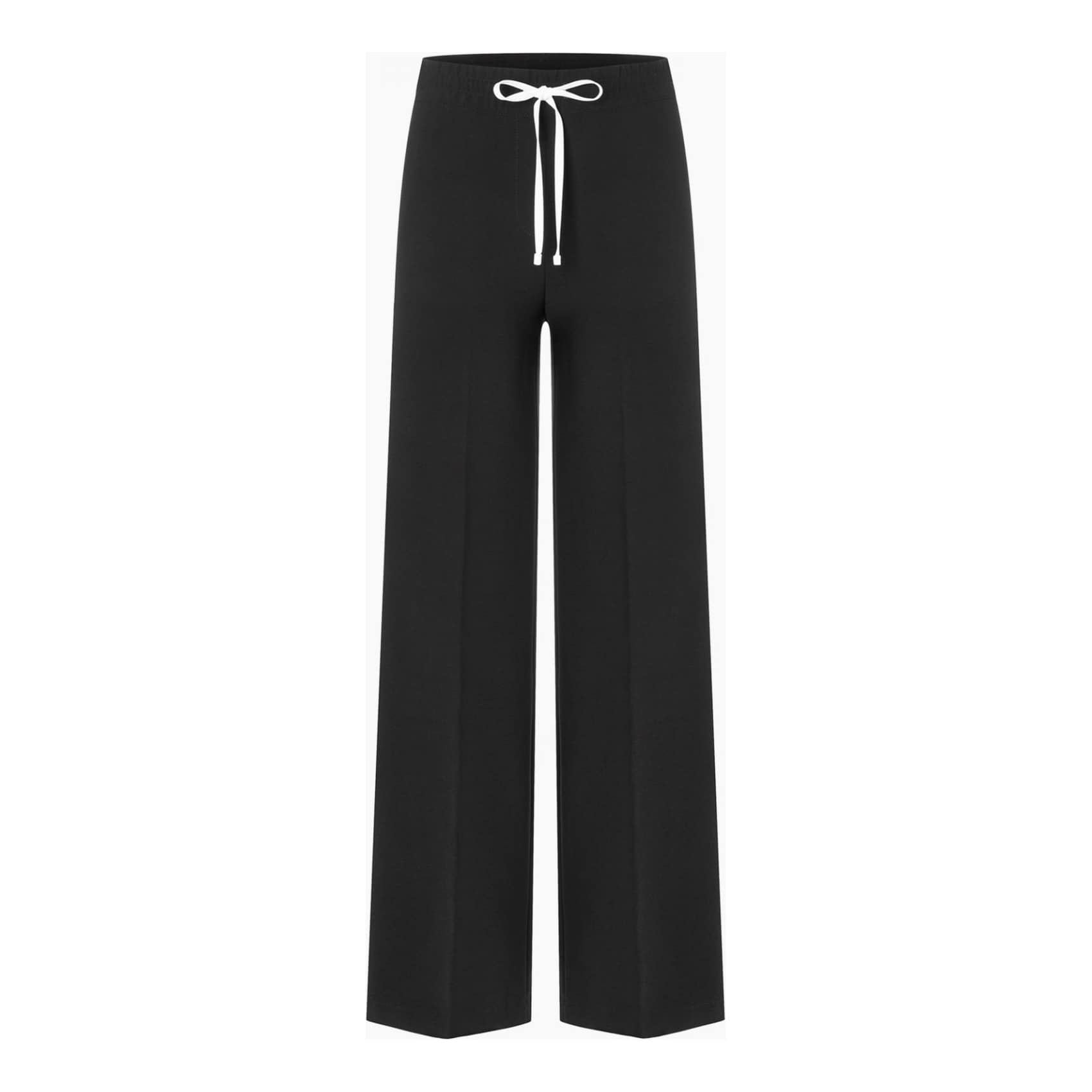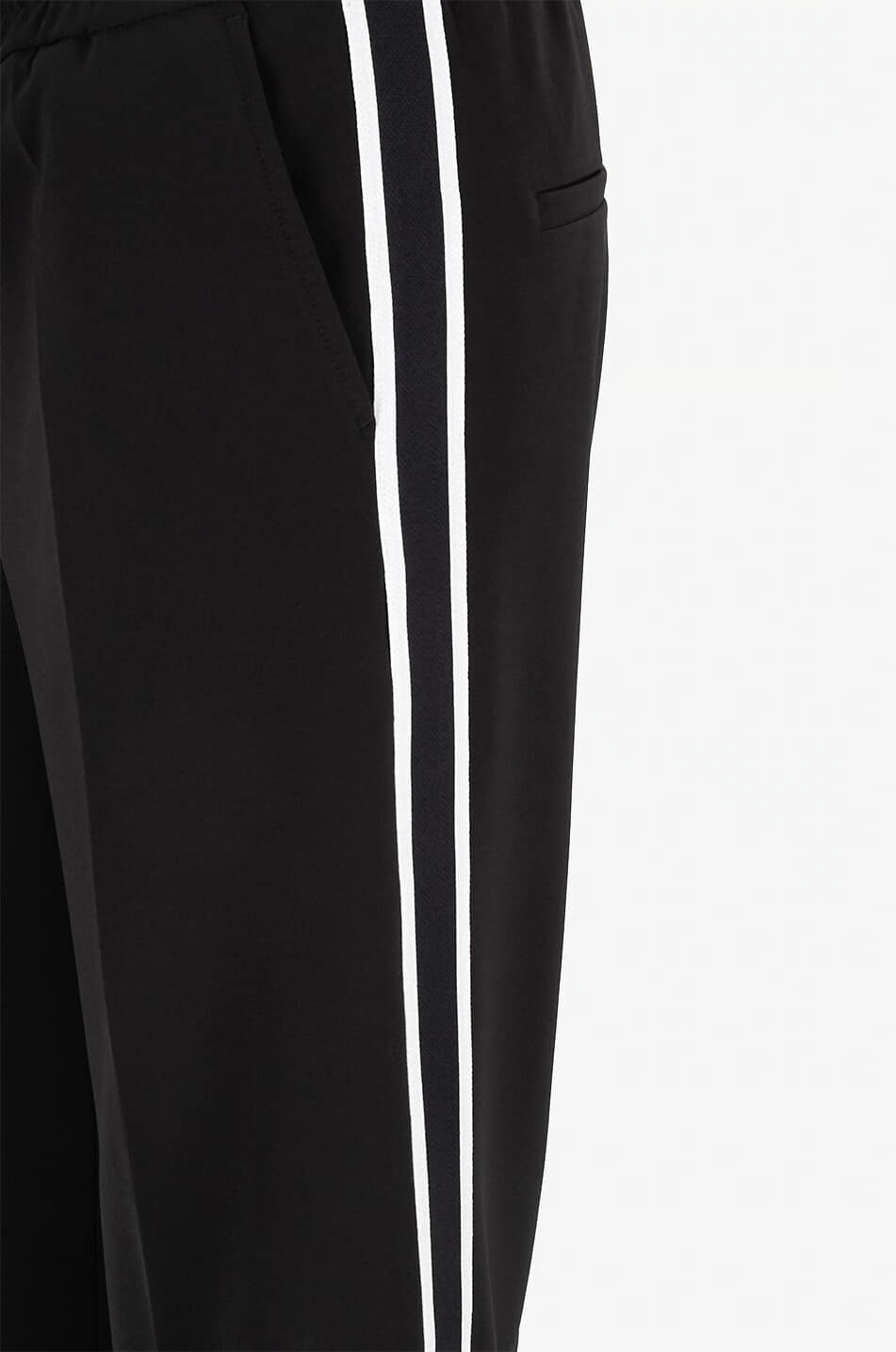 Relaxte, wijde pantalon van Cambio, model Avril. Deze broek is gemaakt van een zwarte, gladde stof en heeft aan beide zijde een dubbele witte streep. De broek heeft een elastische tailleband met trekkoord, rechte wijde broekspijpen, twee steekzakken en sier paspelzakjes.