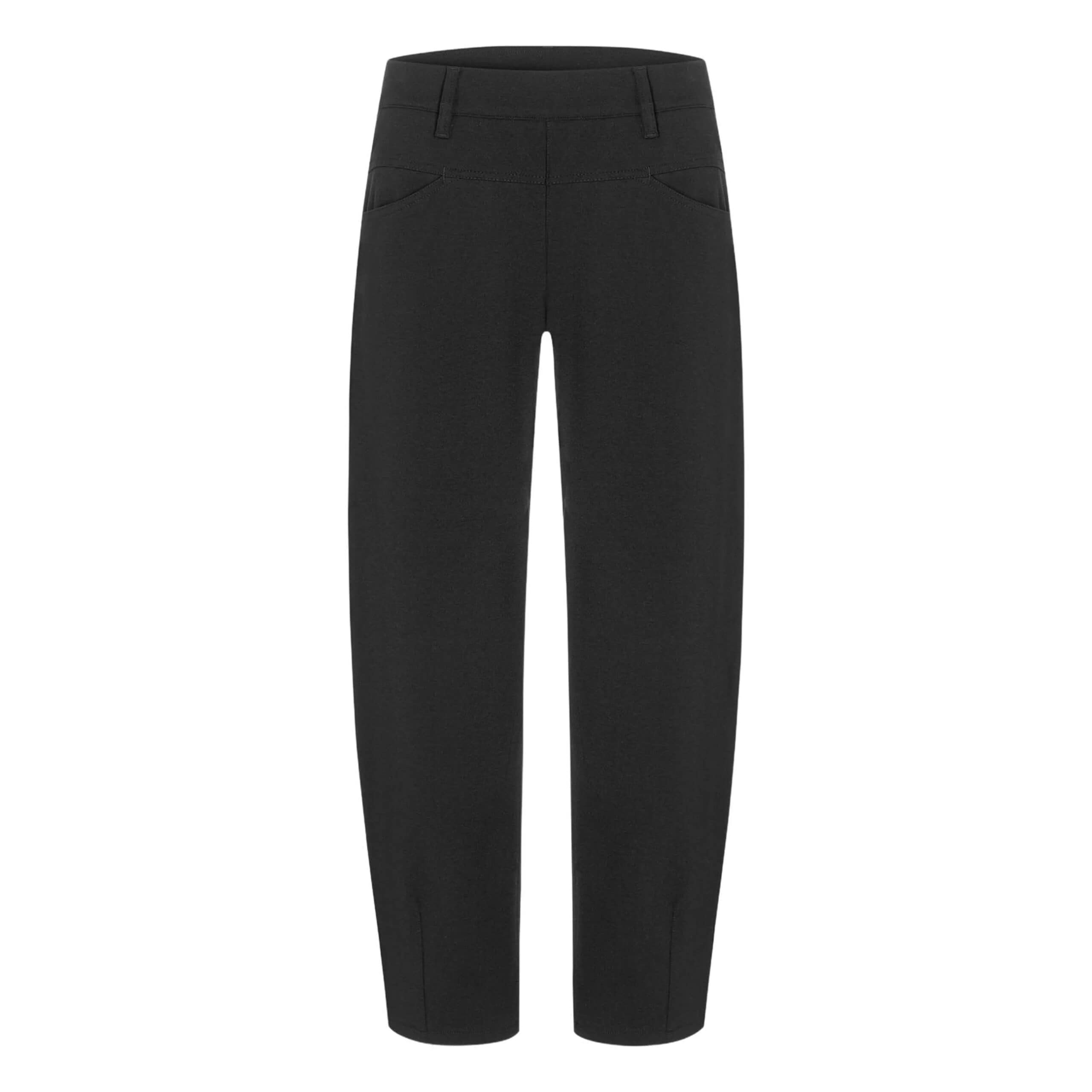 Zwarte pantalon van Cambio, model Elin jogg. Deze broek is gemaakt van zwarte jersey stretch stof en heeft barrel leg fit. De pantalon heeft een elastische tailleband, twee steekzakken en twee achterzakken.