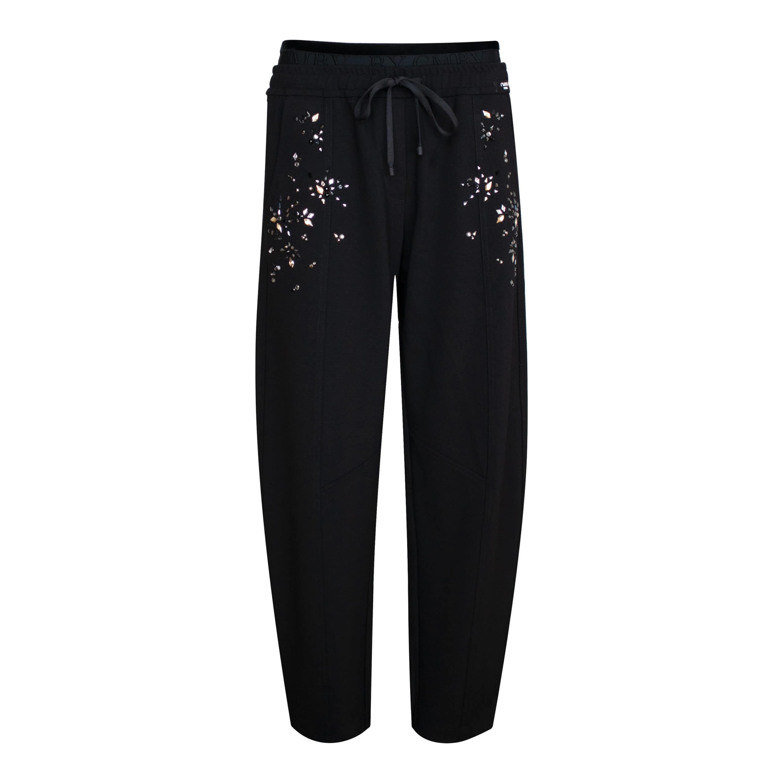 Zwarte pantalon van Cambio, model Eden met strass. Deze broek is gemaakt van een soepele, zwarte stretch stof met aan beide steekzakken strass steentjes en heeft losse broekspijpen die aan de onderzijde toelopen. De pantalon heeft een elastische dubbele taille, trekkoord, twee steekzakken en paspelzakjes.