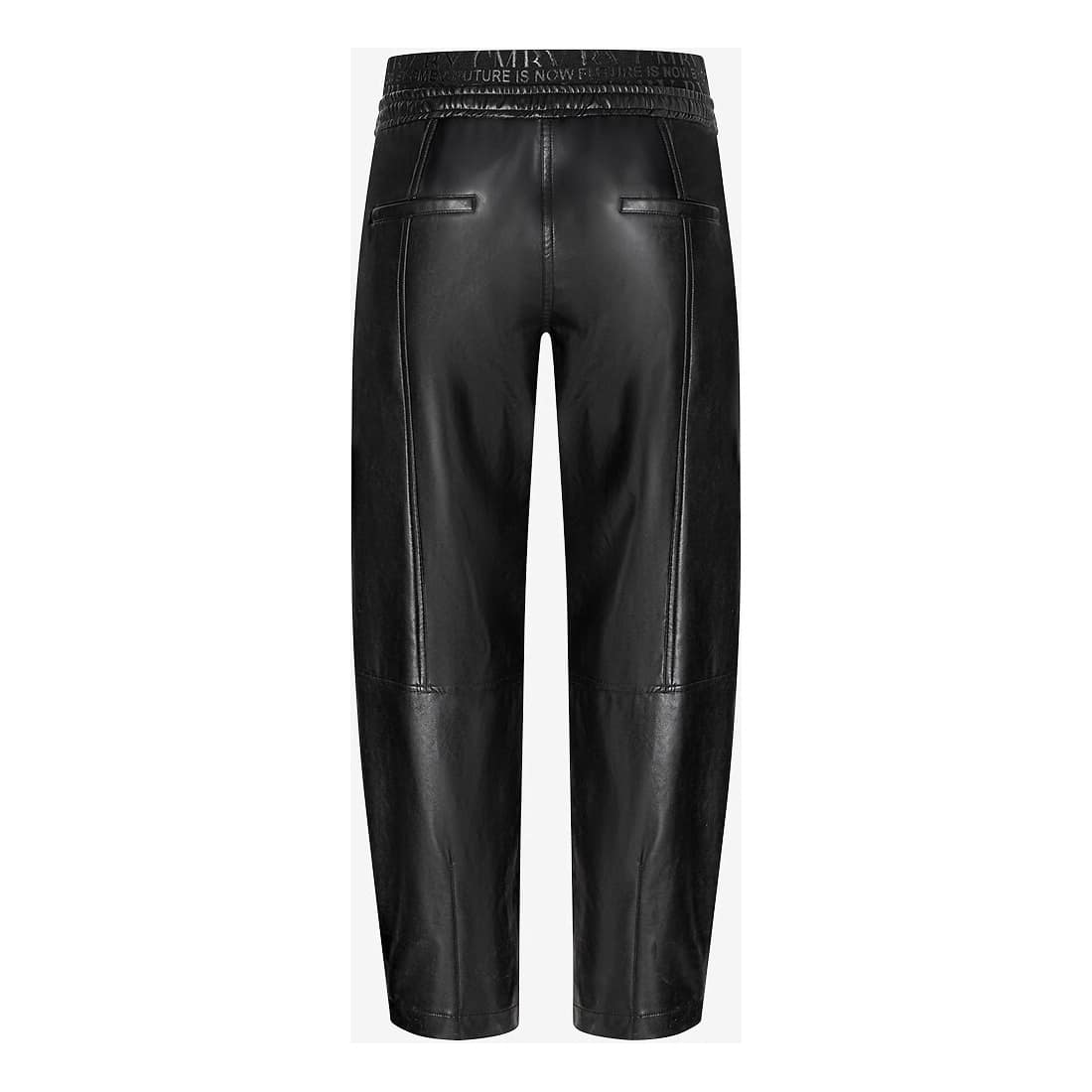 Zwarte faux leather pantalon van Cambio, model Eden. Deze broek is gemaakt van een zwarte leerlook stof en heeft losse broekspijpen met een balloon fit die aan de onderzijde toelopen. De pantalon heeft een elastische dubbele taille, trekkoord, twee steekzakken en paspelzakjes.