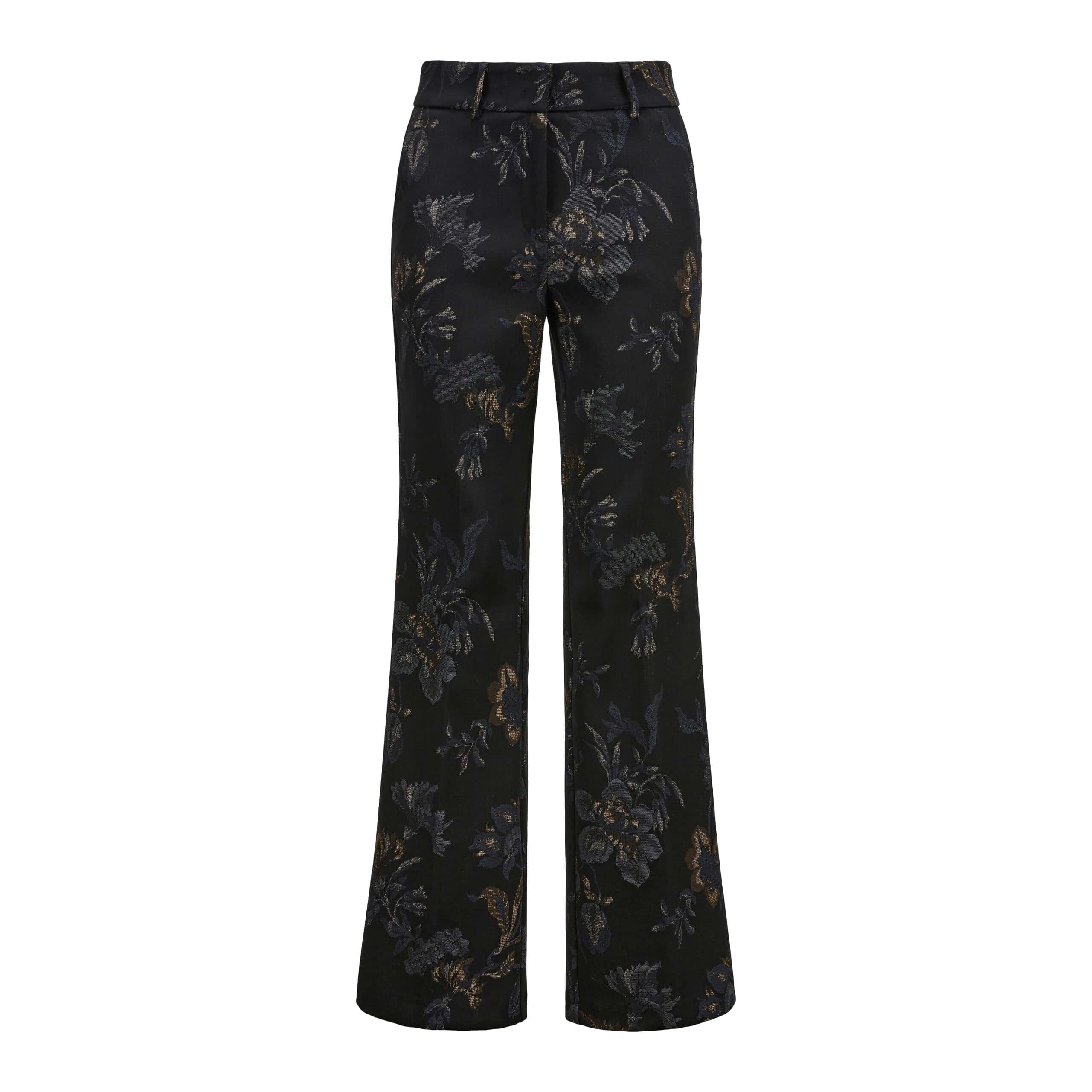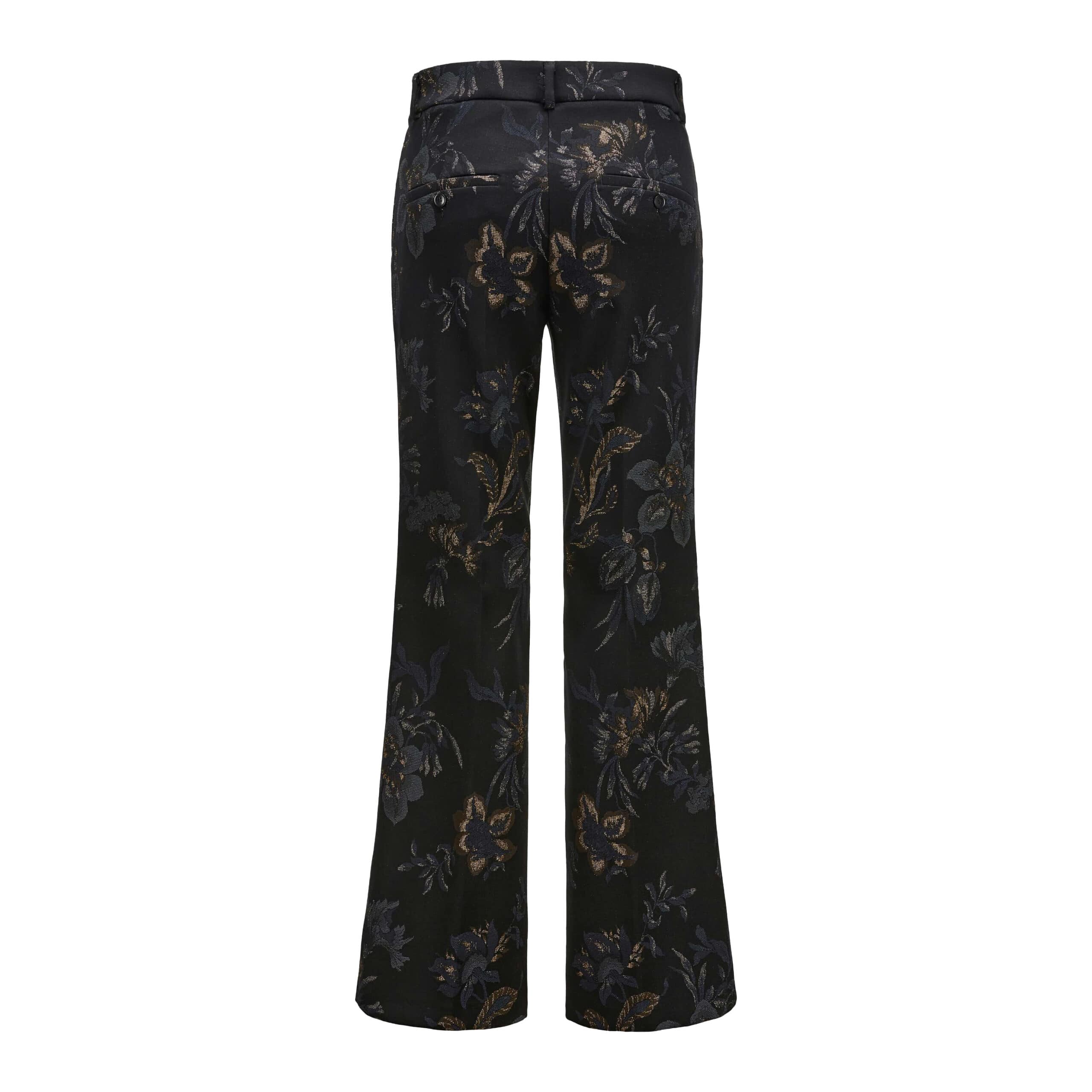Zwarte pantalon met bloemen van Cambio, model France. Deze broek is gemaakt van een zwarte katoenen stretch stof met een jacquard bloemen patroon in donkerblauw en bruin en heeft licht uitlopende broekspijpen. De pantalon sluit met een haakje, knoop- en ritssluiting, heeft twee steekzakken en twee paspelzakjes.