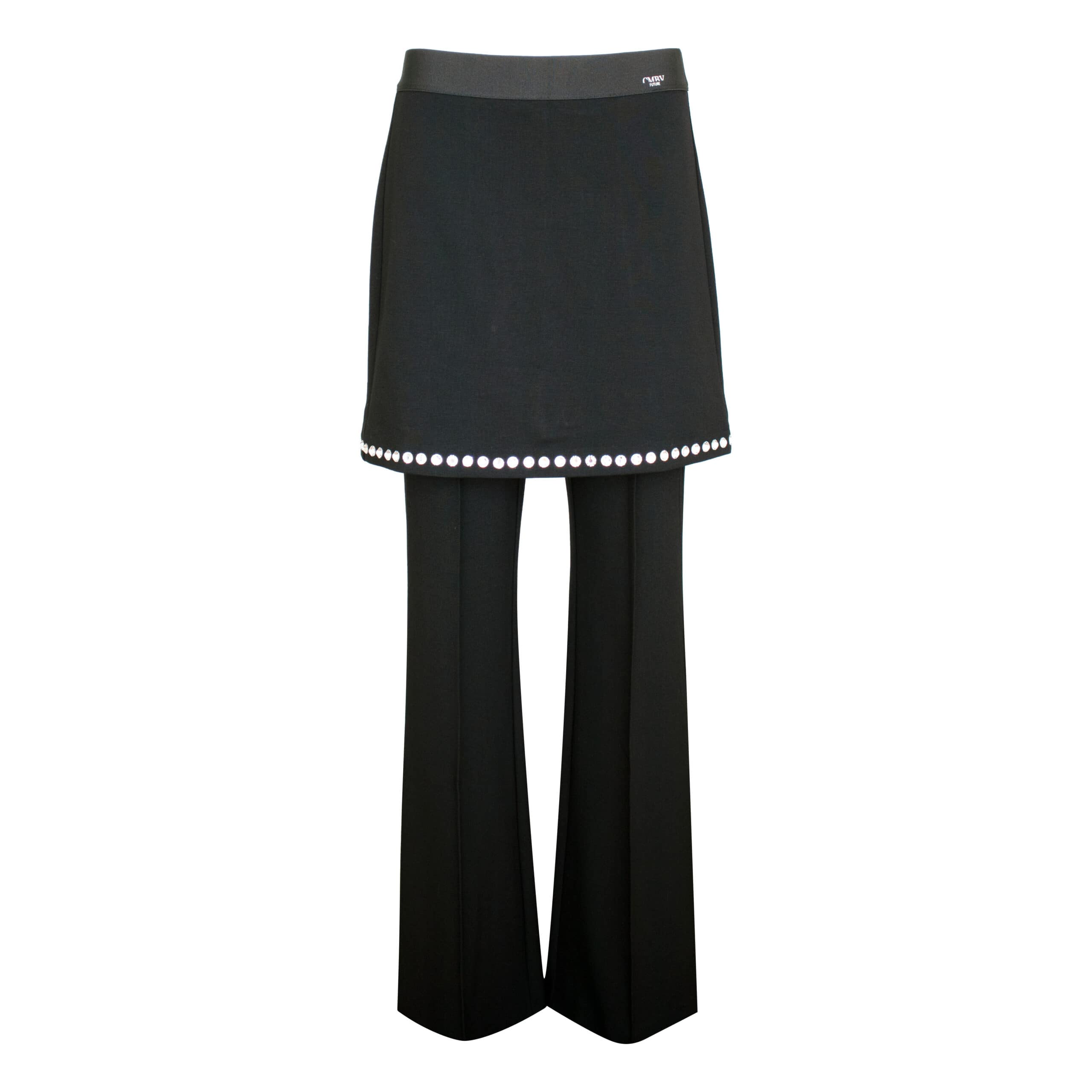 Zwarte pantalon met rok van Cambio, model Francis skirt. Deze broek met rok is gemaakt van een soepele stretch stof en heeft op de broek een vast naad aan de voorzijde. De pantalon met rok heeft een elastische tailleband, licht uitlopende broekspijpen en de rok is bezet met steentjes aan de zoom. De rok en pantalon kunnen niet los gedragen worden, ze zitten aan elkaar vast.