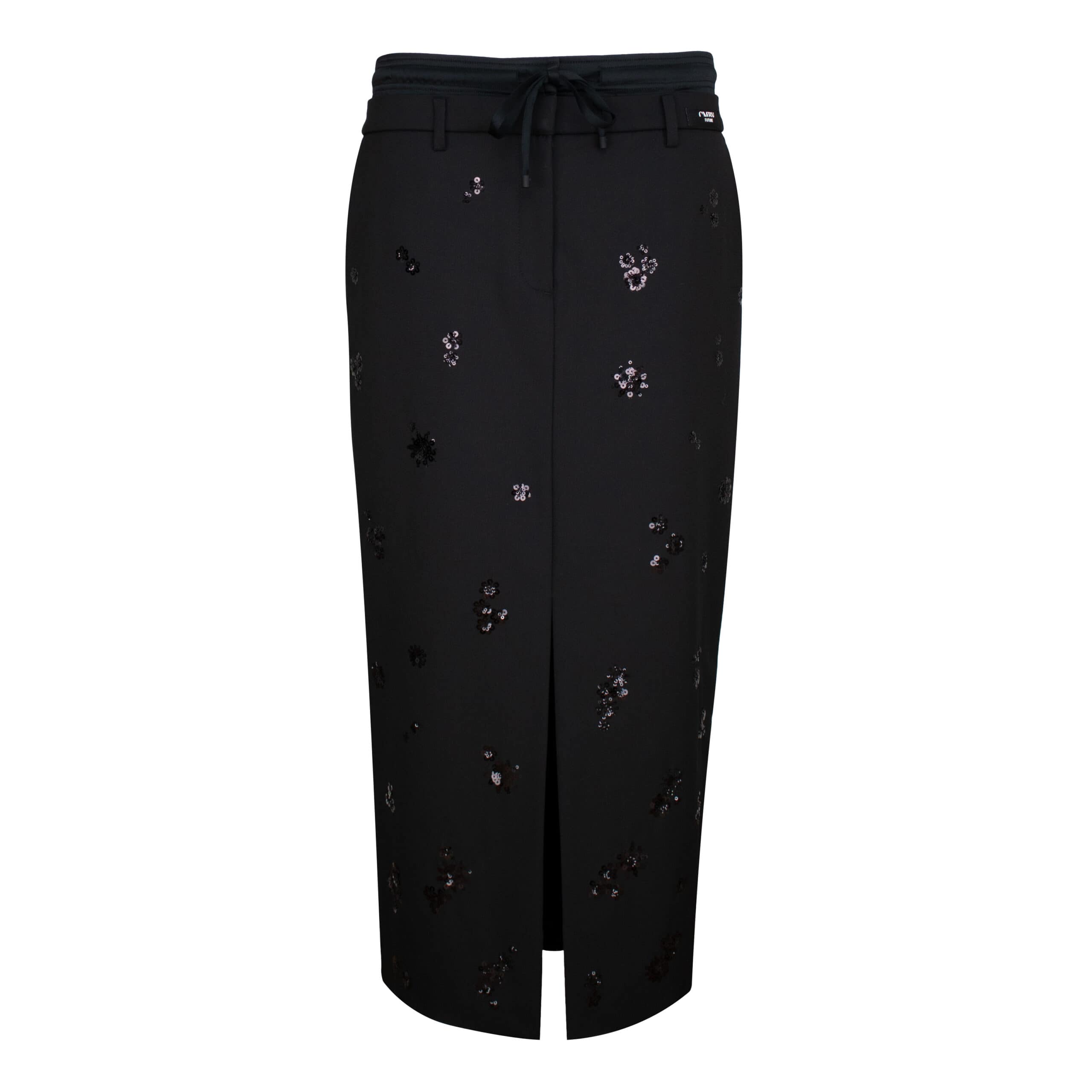 Zwarte rok van Cambio, model Heaven double waist. Deze lange rok is gemaakt van zwarte stretch stof met pailletten in ronde vormen, heeft een split aan de voorzijde en valt op de kuiten. De rok heeft een dubbele tailleband, waarvan de bovenste een elastische tailleband met een trekkoord is, beide sluiten met haakjes, knoop- en ritssluiting.
