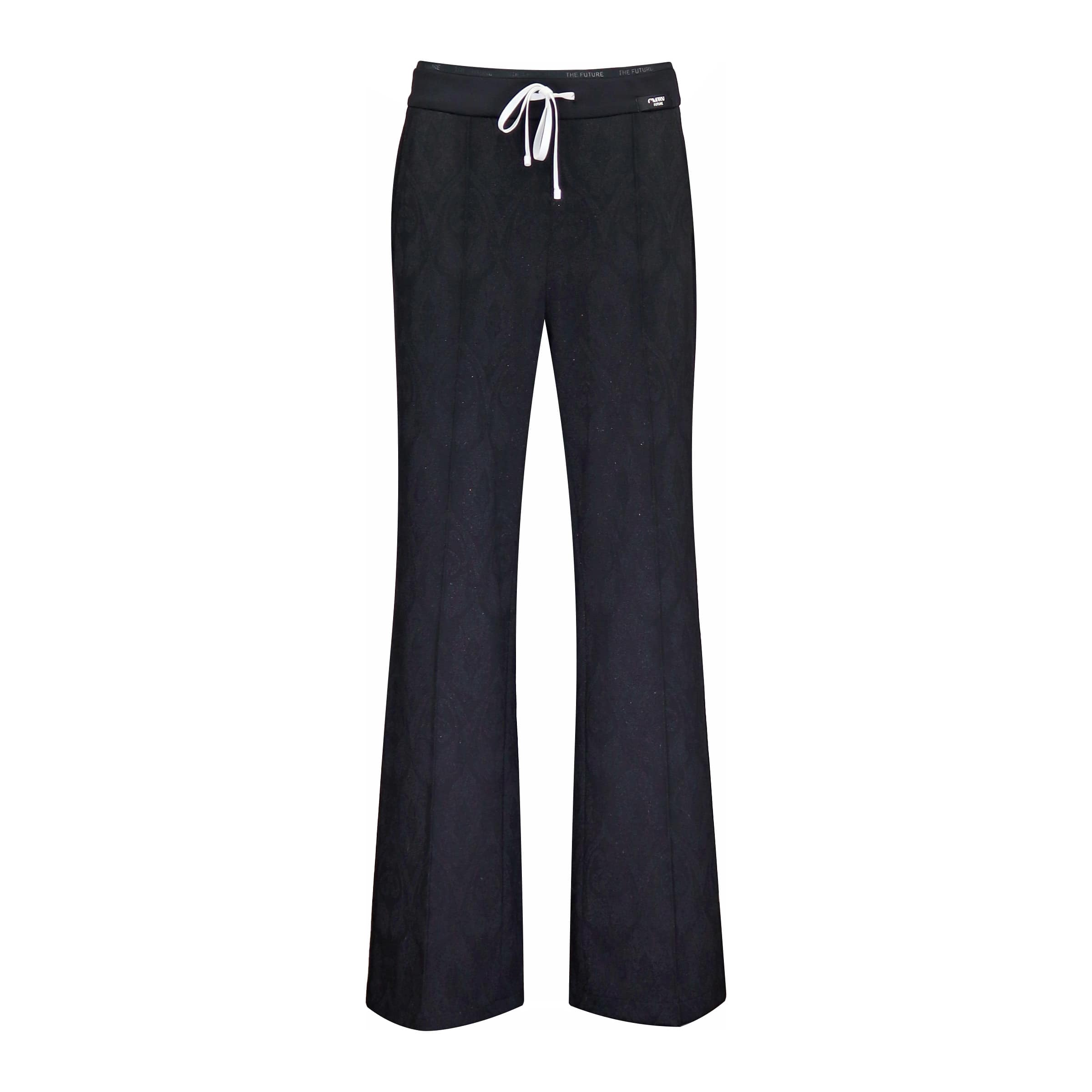 Wijde pantalon van Cambio, model Ava jogg. Deze broek is gemaakt van een zwarte stretch stof met een motief. De broek heeft een elastische tailleband met trekkoord, hoge taille en wijde licht uitlopende broekspijpen met een vast naad in het midden.