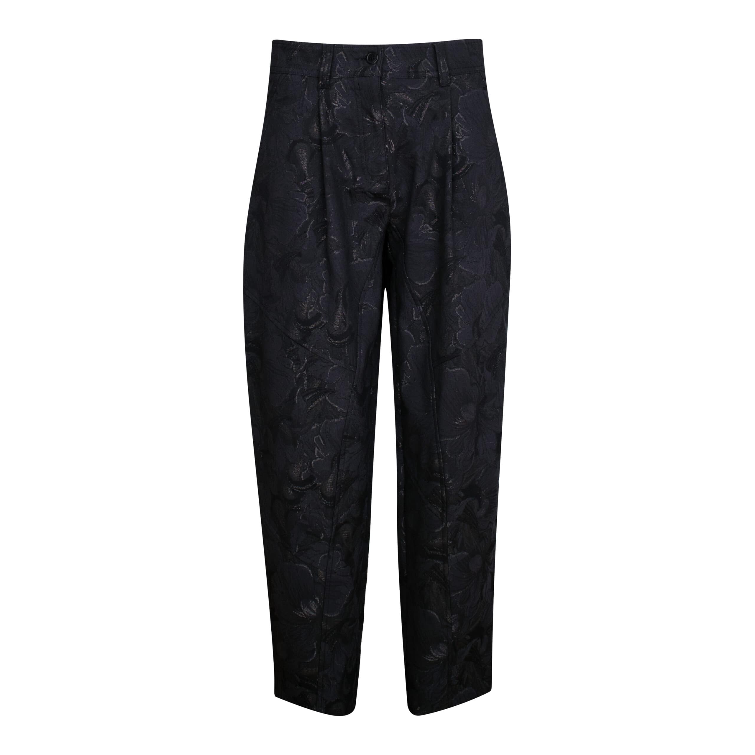 Zwarte pantalon van Cambio, model Ocean seam. Deze broek is gemaakt van een stevige zwarte stof met een metalic bloemen patroon en heeft een barrel pasvorm. De broek sluit met een knoop- en ritssluiting, heeft twee steekzakken en twee paspelzakjes.
