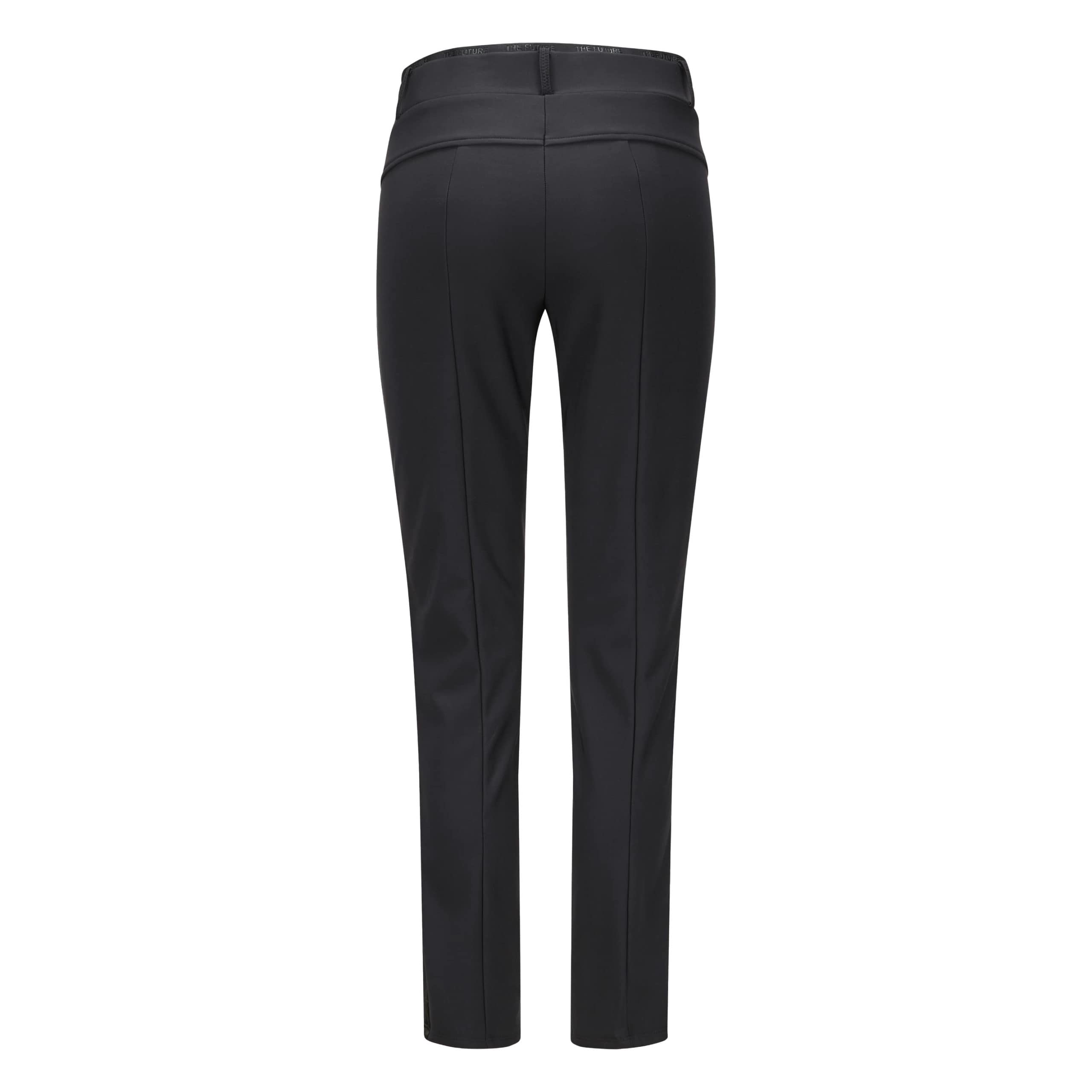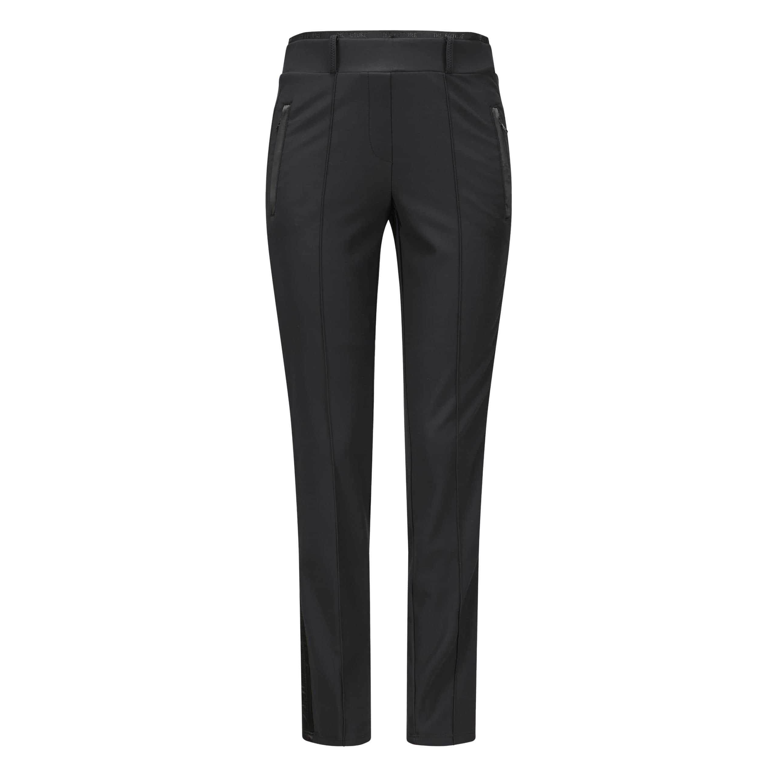 Zwarte pantalon van Cambio, model Rarity. Deze broek is gemaakt van een zwarte gladde techno stretch stof met een subtiele zwarte bies, heeft een slim fit pasvorm en toelopende broekspijpen. De broek heeft een elastische taille, twee steekzakken achter ritsjes en een vaste naad over de voorkant van de broekspijpen.