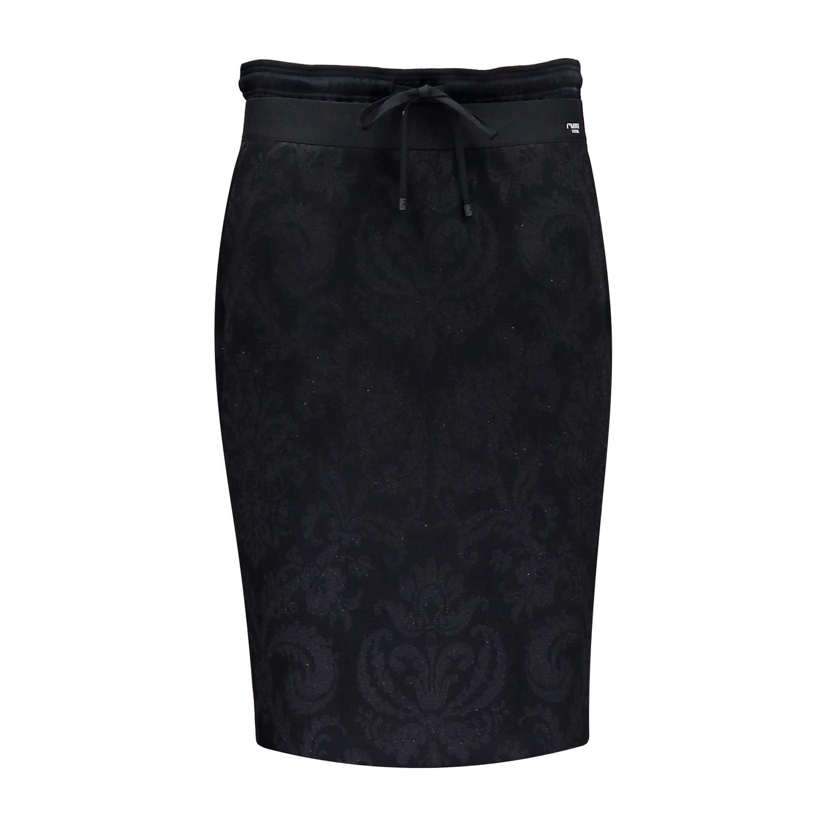 Zwarte rok van Cambio, model Harmony. Deze rok is gemaakt van zwarte stretch stof waar een metalic draad doorheen verweven is en heeft een subtiel paisley motief. De rok heeft een elastische taille met een trekkkoord, een splitje aan de achterzijde en valt op de knie.