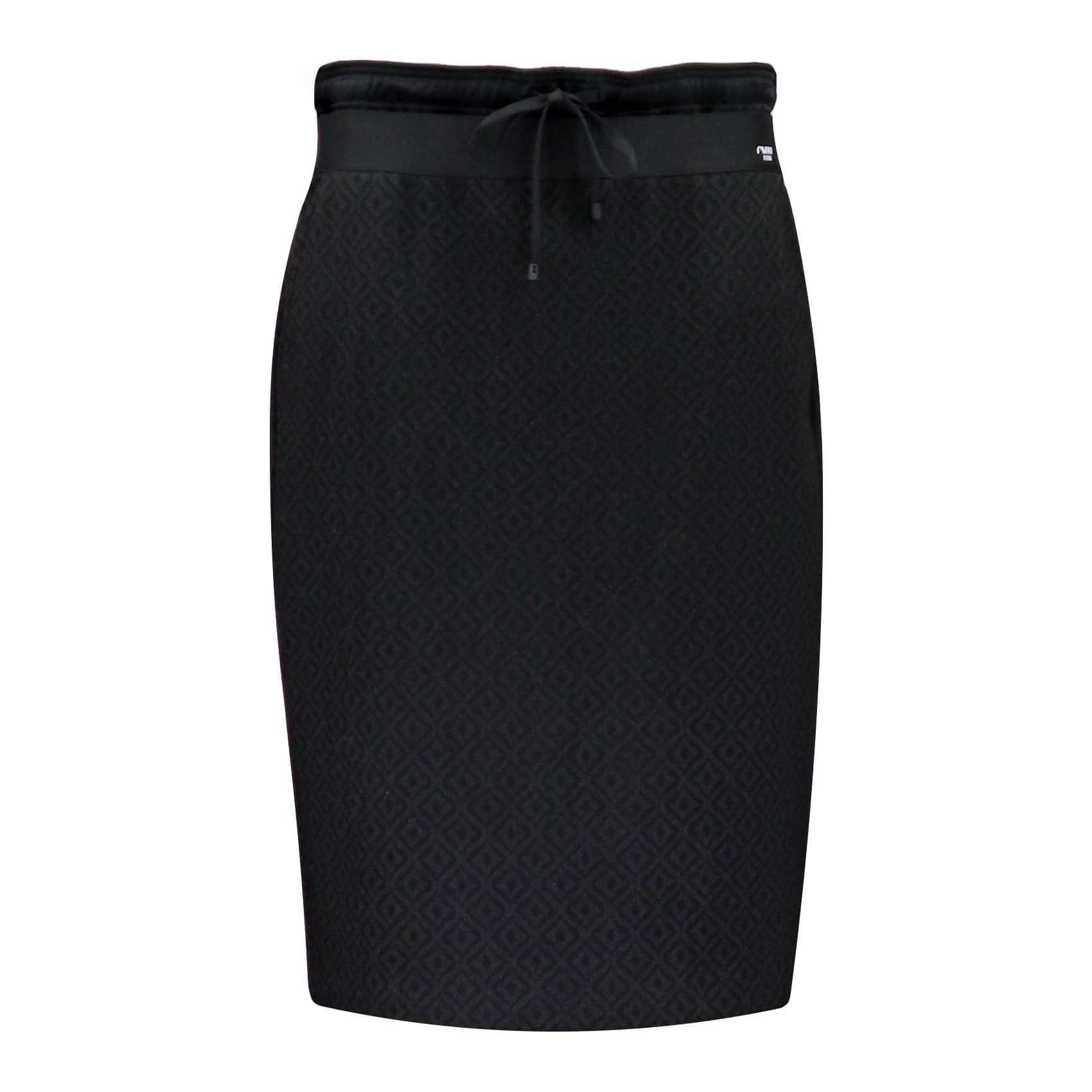 Zwarte rok van Cambio, model Harmony. Deze rok is gemaakt van zwarte stretch stof waar een metalic draad doorheen verweven is en heeft een subtiel motief met ruitjes. De rok heeft een elastische taille met een trekkkoord, een splitje aan de achterzijde en valt op de knie.