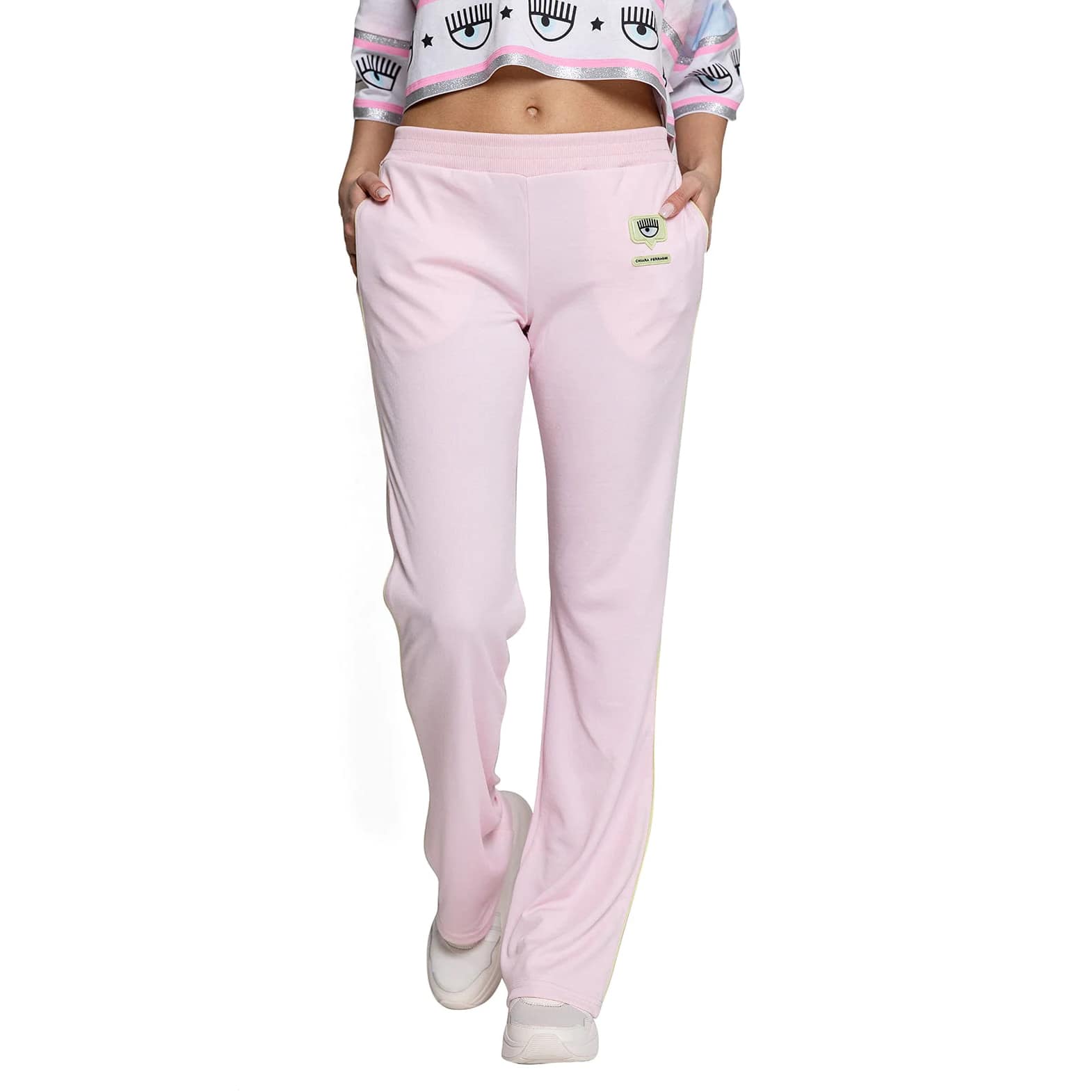 Roze track pants van Chiara Ferragni, model pant colour. Deze lange broek heeft een relaxte pasvorm met het kenmerkende logo op de voorzijde. De jogging broek heeft een elastische taille, lange iets uitlopende broekpijpen, twee steekzakken en een klein geel biesje aan de zijkant.