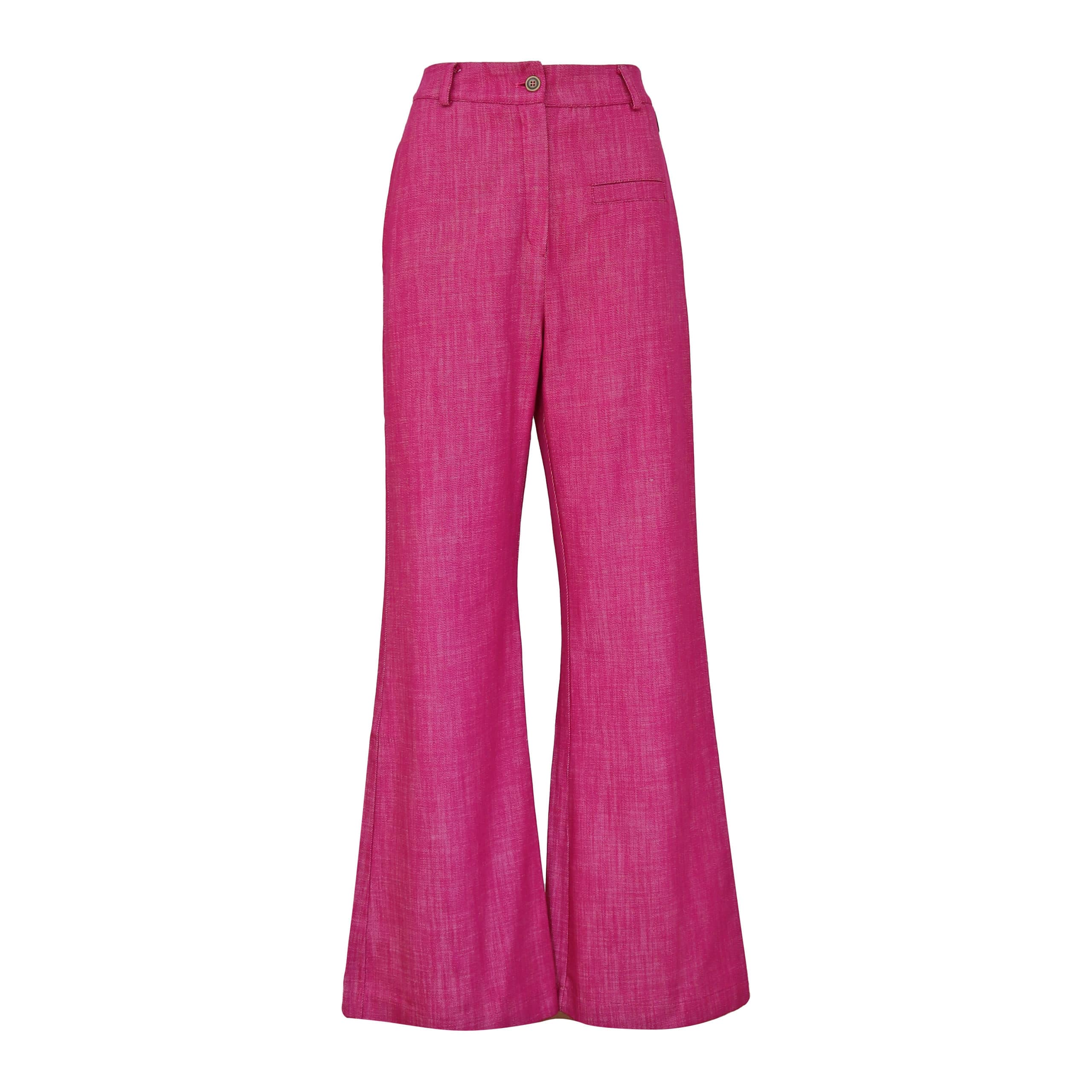 Fuchsia jeans van Dame Blanche. Deze lange broek is gemaakt van katoen en heeft een hoge taille met wijd uitlopende broekspijpen. De jeans sluit met een knoop- en ritssluiting en heeft twee steekzakken.