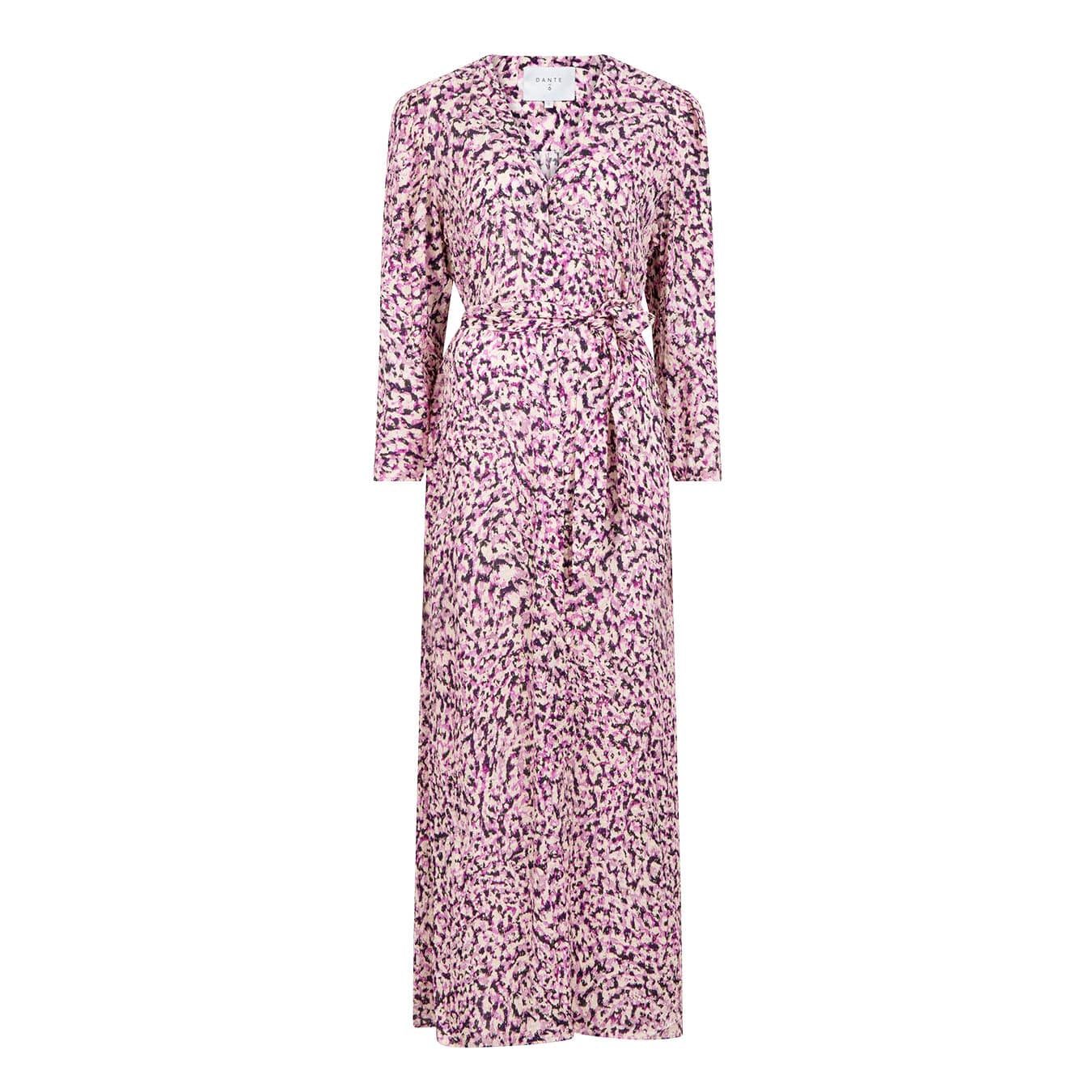 Maxi jurk van Dante6, model Kura in multicolor. Deze paars roze jurk is gemaakt van een stof met structuur en heeft een bijpassende ceintuur. De blouse jurk heeft een V-hals, sluit met kleine knoopjes aan de voorzijde die van boven tot onder lopen en heeft lange mouwen.