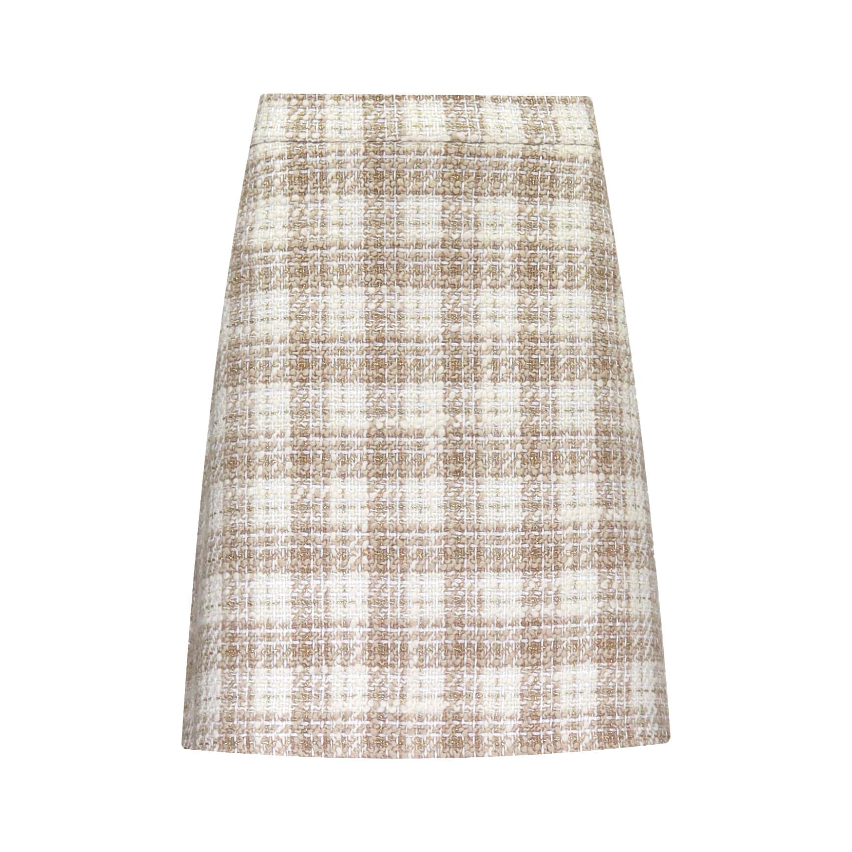 Tweed rok van Due Amanti, model Reece without buttons in beige. Deze rok heeft een geruite beige tekening met een subtiele gouddraad en twee decoratieve zakjes aan de zijkant. De rok sluit met een verborgen ritssluiting aan de achterzijde, heeft een licht uitlopende pasvorm en valt boven de knie.