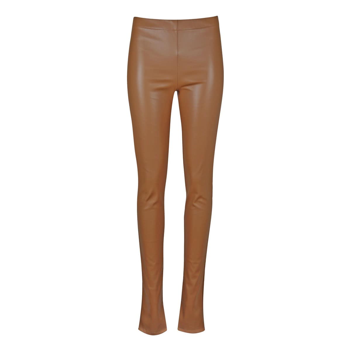 Lange bruine pantalon van Eight Paris. Deze broek is gemaakt van een stof met leerlook en heeft een aansluitende pasvorm. De broek heeft een elastische tailleband en lange broekspijpen met een klein splitje aan de onderzijde.