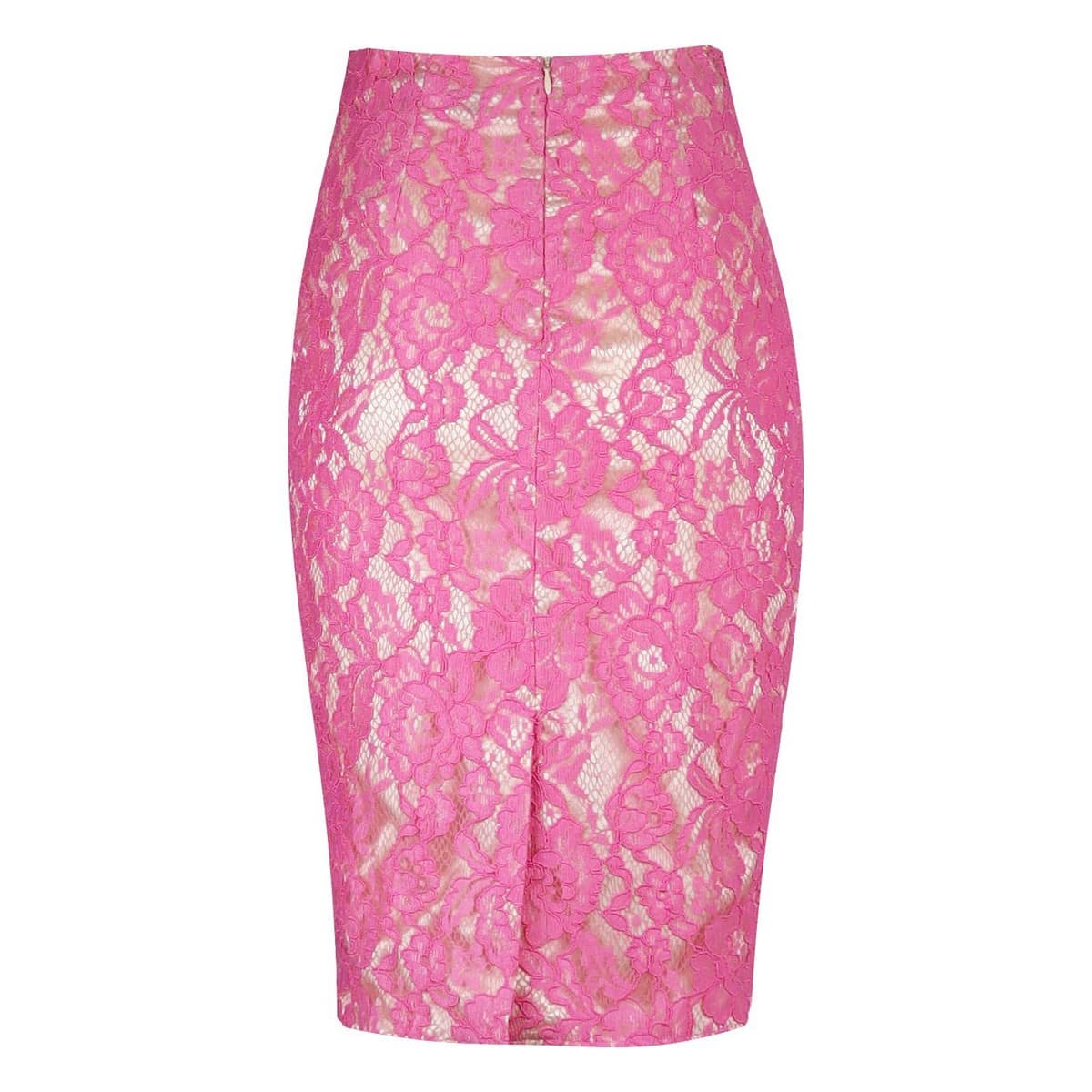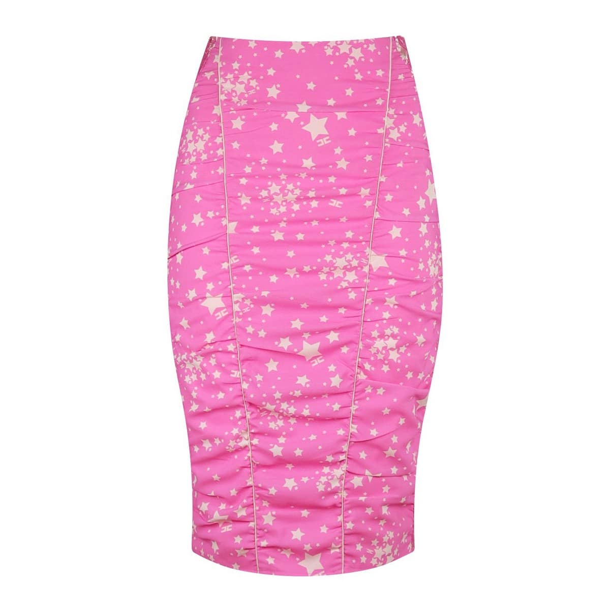 Roze kokerrok van Elisabetta Franchi. Deze rok heeft een hoge taille en aan de voorzijde een tekening met witte sterren en het Elisabetta Franchi logo. Aan de achterzijde is de rok gevoerd en gemaakt van kant met een kleine split.