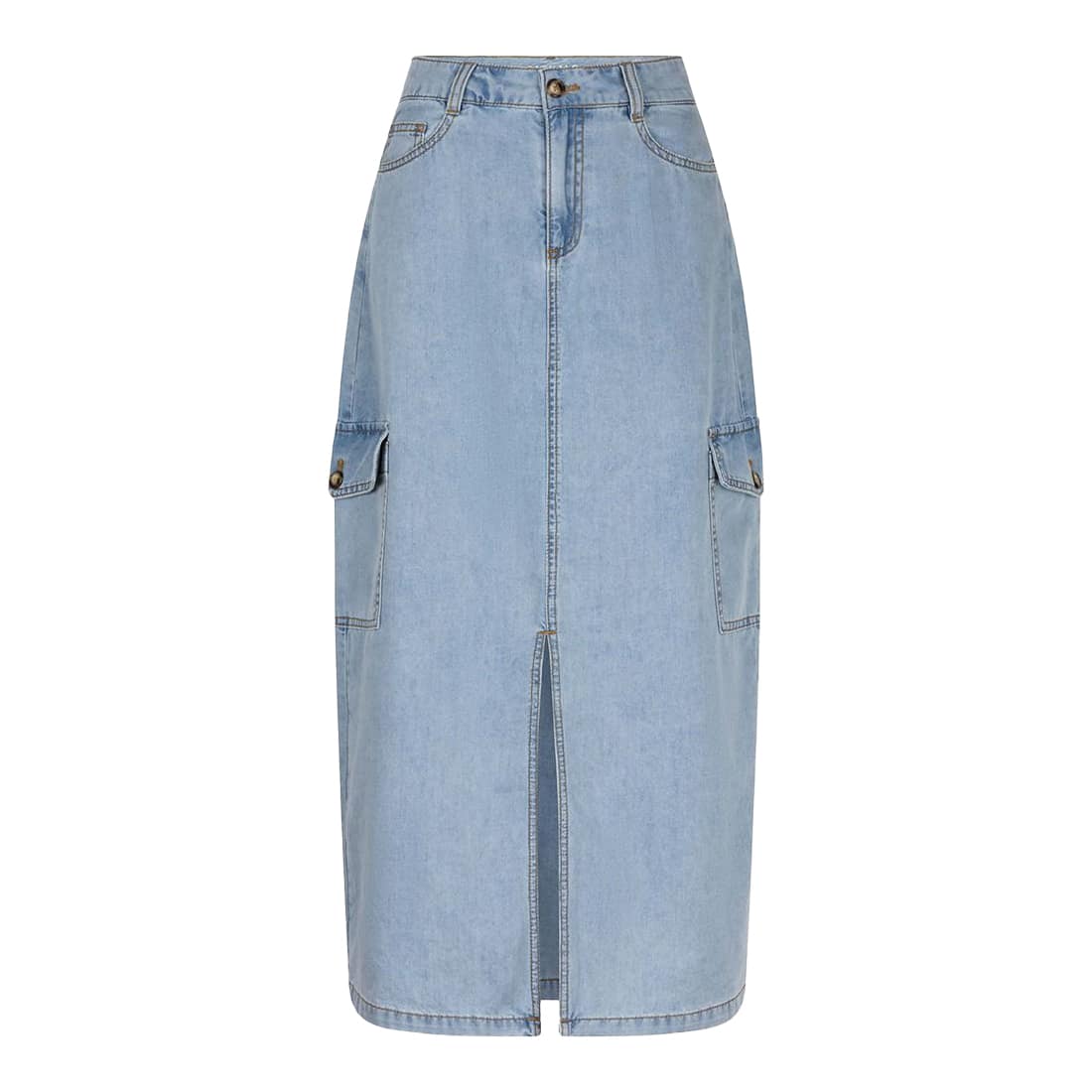 Cargo jeans rok van EsQualo in blue. Deze midi rok is gemaakt van lichtblauwe denim, valt op de kuiten en heeft een hogere taille. De rok sluit met een knoop- en ritssluiting en heeft twee steekzakken, twee achterzakken en twee cargo zakken.