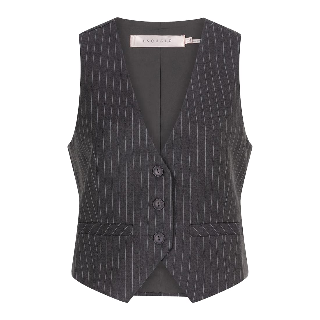 Grijs gestreept vest van EsQualo in dark grey. Het gilet sluit aan de voorzijde met 3 knopen en en heeft twee sier paspelzakjes en een kortere pasvorm.