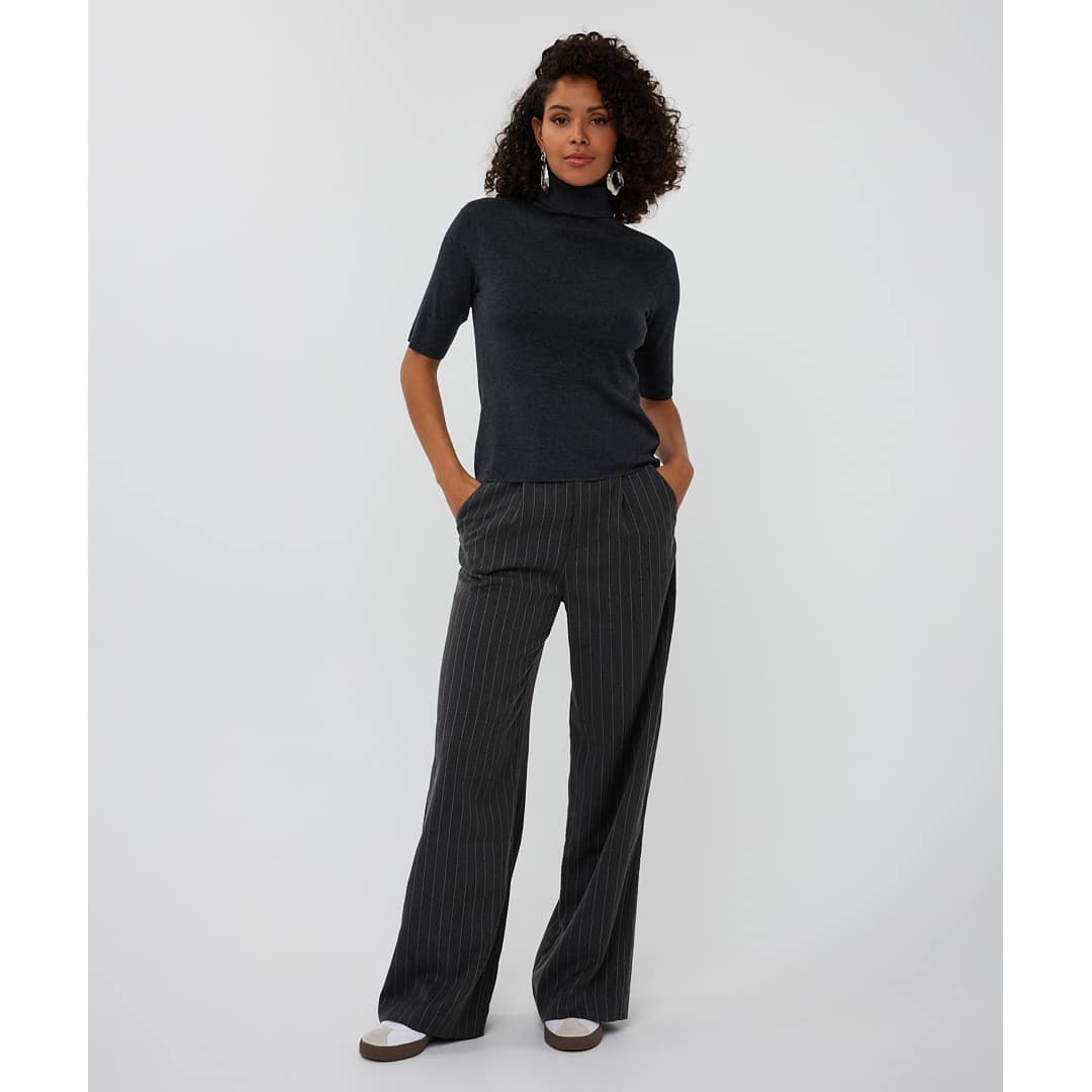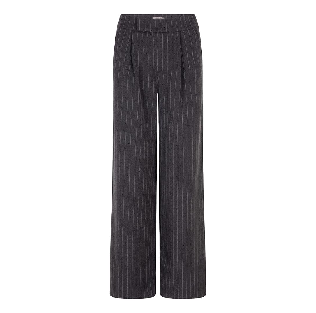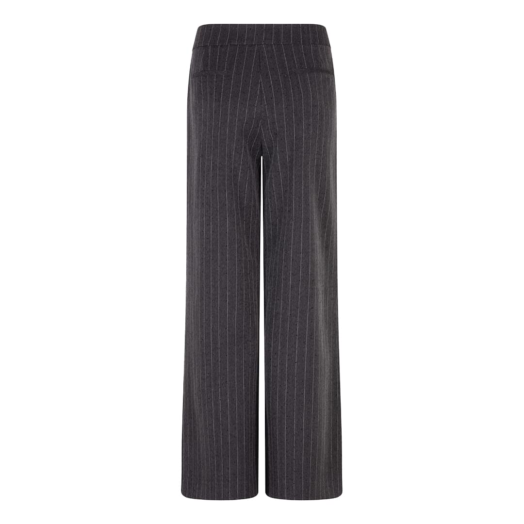 Grijze gestreepte pantalon van EsQualo in dark grey melange. Deze lange pantalon is gemaakt van een grijze gestreepte stof die bezet is met kleine steentjes, is geplooid in de taille en heeft een rechte, wijde pasvorm. De pantalon sluit met een knoop- en ritssluiting, heeft twee steekzakken en twee sier paspelzakken.