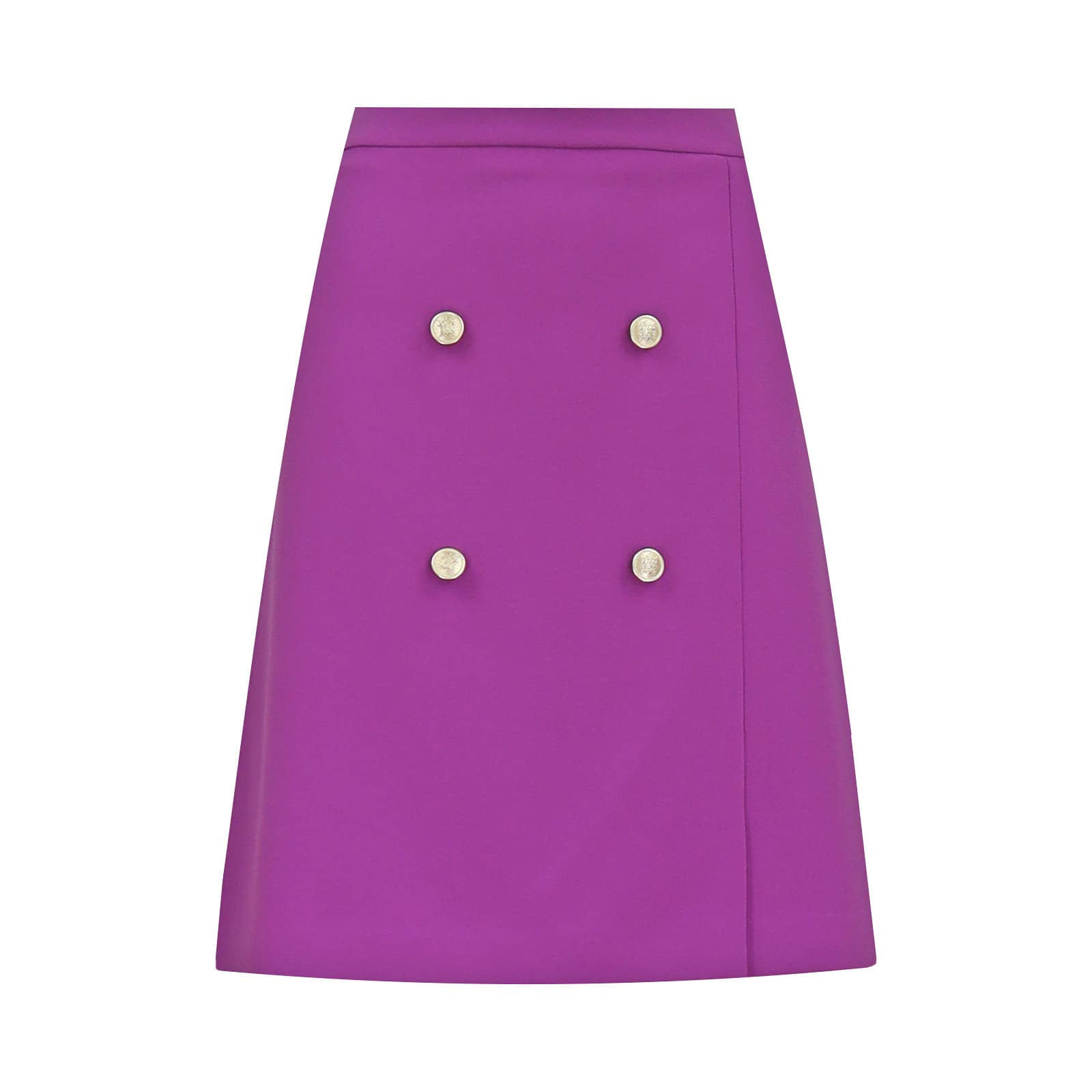 Korte rok van EsQualo in violet. Deze rok is gemaakt van effen paarse stof en heeft vier decoratieve knopen aan de voorzijde. De rok is gevoerd en sluit met een verborgen ritssluiting aan de achterzijde.