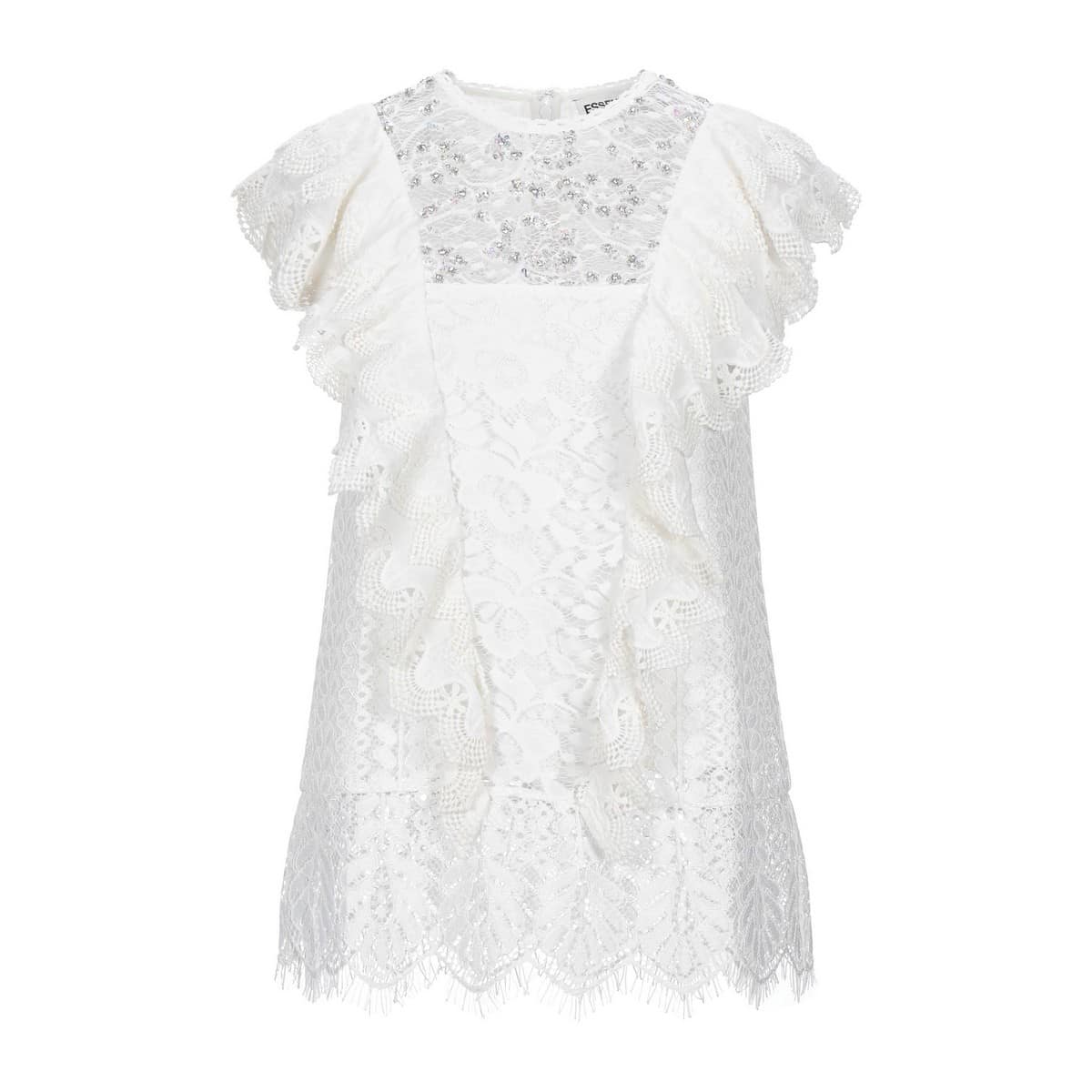 Kanten top van Essentiel, model Valaplaya. Deze volledig kanten top heeft aan de bovenzijde geborduurde witte en zilveren kraaltjes. De top is gevoerd en heeft aan de achterzijde een verborgen ritssluiting.