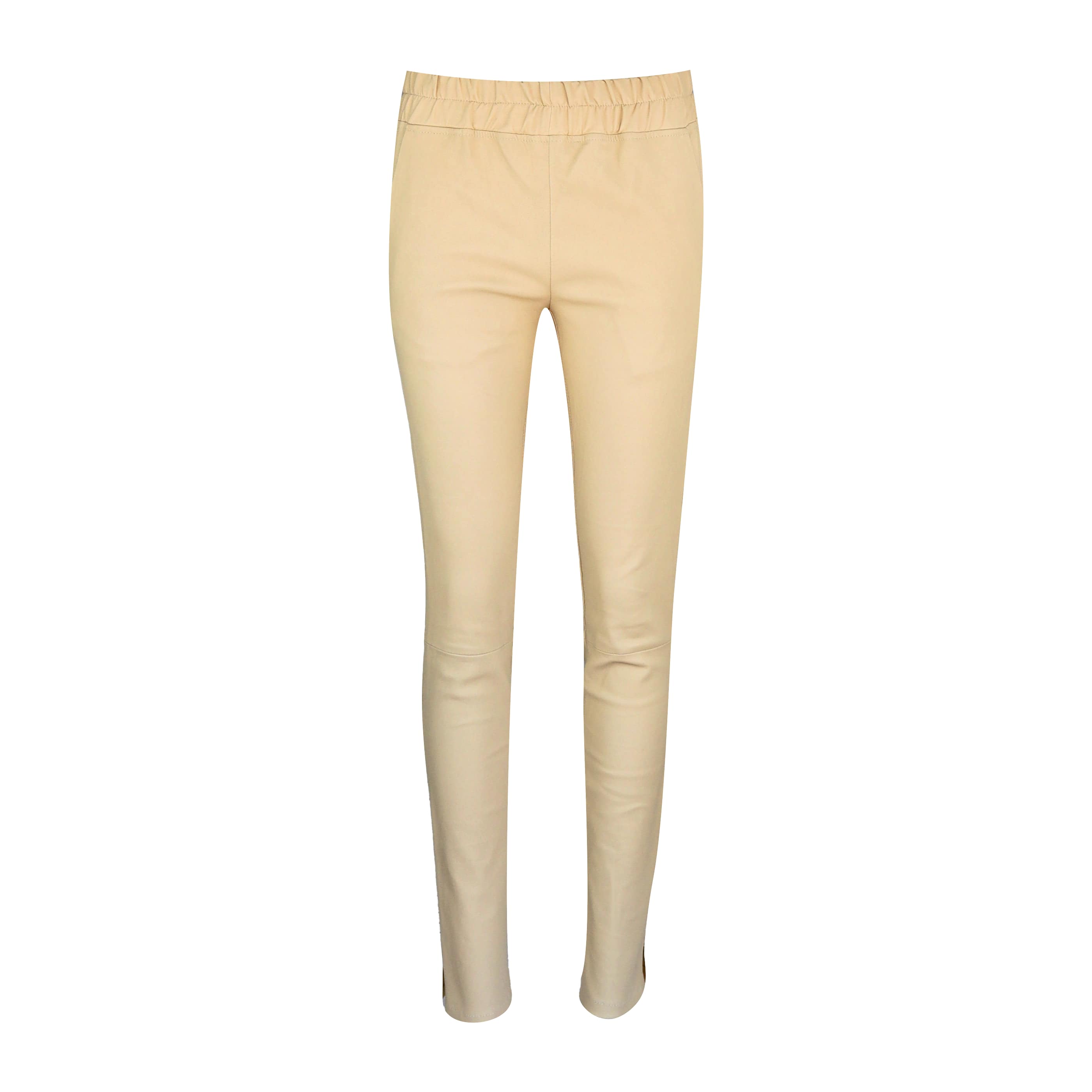 Stretch leren pantalon van Est’seven, model Est’Chino in shifting sand. Deze effen zandkleurige broek is gemaakt van stretch leer en heeft een aansluitende pasvorm. De broek heeft een elastische taille en een splitje onderaan de broekspijpen.