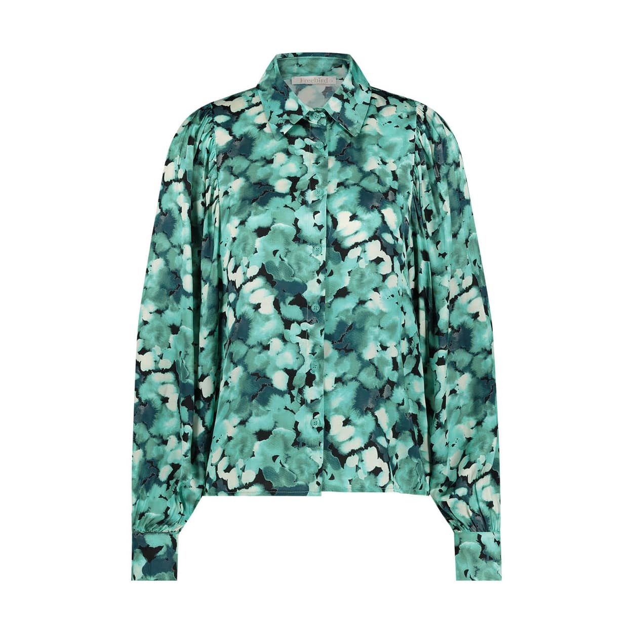 Groene blouse van Freebird, model Kendall, splash satin vis. Deze blouse is gemaakt van gladde stof van viscose en zijde en heeft een groene all-over print. De blouse heeft een klassieke kraag en vrouwelijke lange wijde pofmouwen.