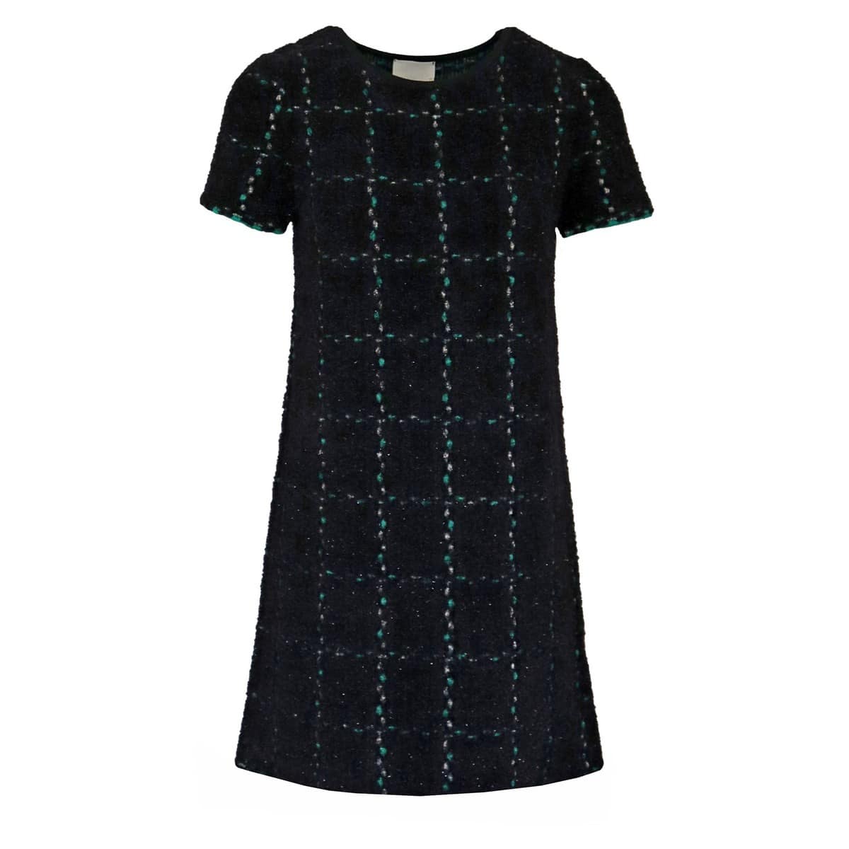Kleedje van Friendly Sweater by Compagnia Italiana. Deze zwarte jurk is gemaakt van een wol mix met een klein glittertje en heeft een groen geruit patroon. De jurk heeft een ronde hals, korte mouwen en een aansluitende pasvorm die licht uitloopt.