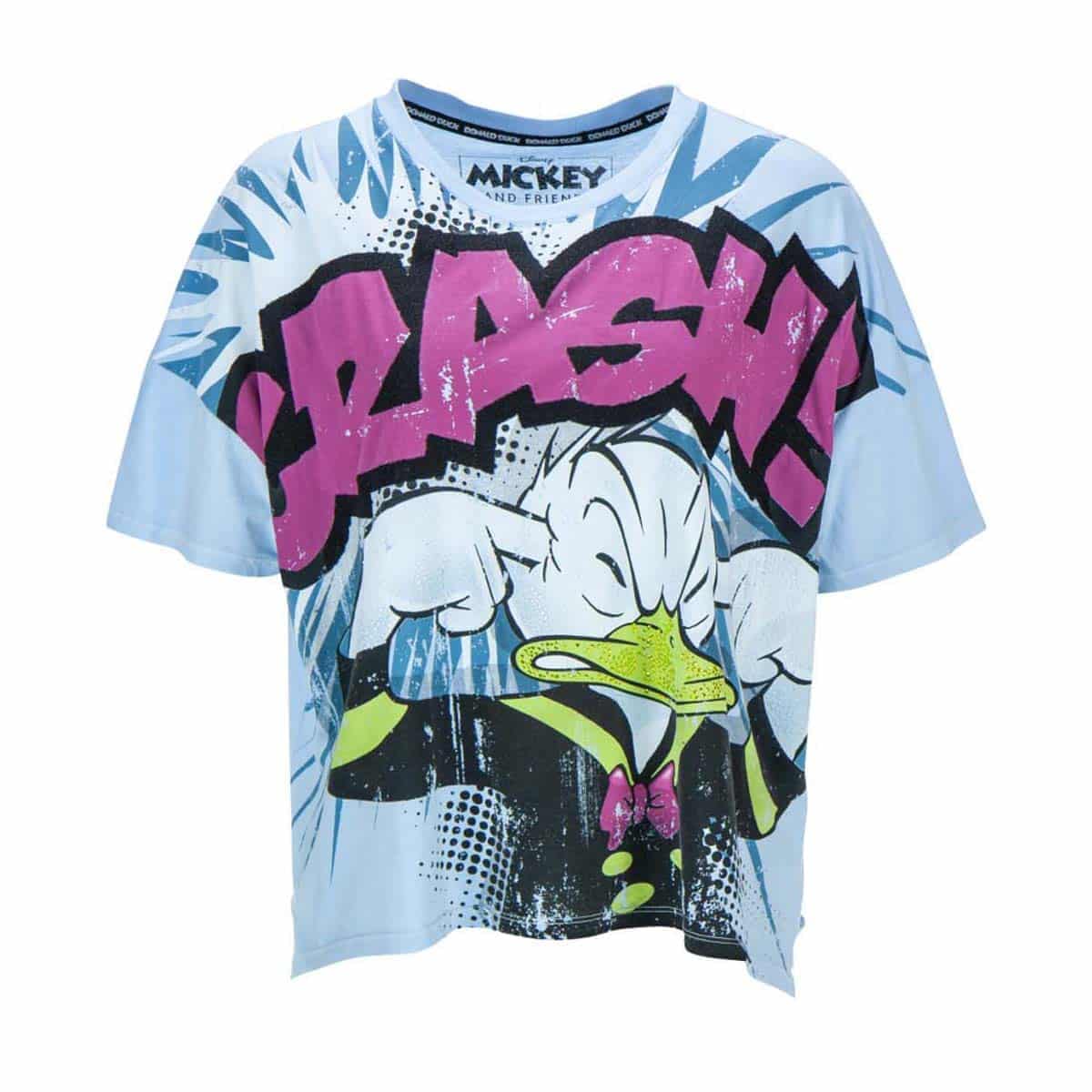 Blauw t-shirt van Frogbox. Dit oversized, cropped shirt heeft op de voorzijde een afbeelding van Donald met het woord crash. De snavel en witte gedeelte van Donald zijn bezet met kleine steentjes.