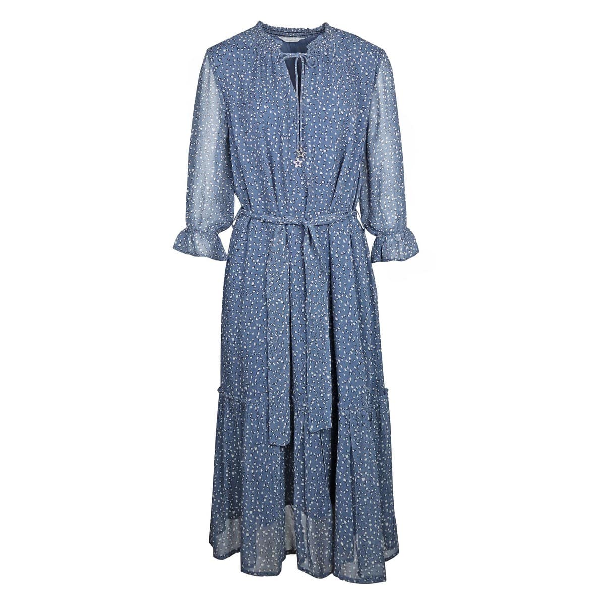 Midi kleedje van Frogbox. Deze lange jurk is gemaakt van een blauwe stof met witte vlekjes met voering en valt tot onder de knie. Aan de voorzijde heeft de jurk een V-insnede met lintjes waar een ster aan hangt. Deze kun je elegant over elkaar heen slaan. Je taille kun je accentueren met de bijpassende ceintuur.