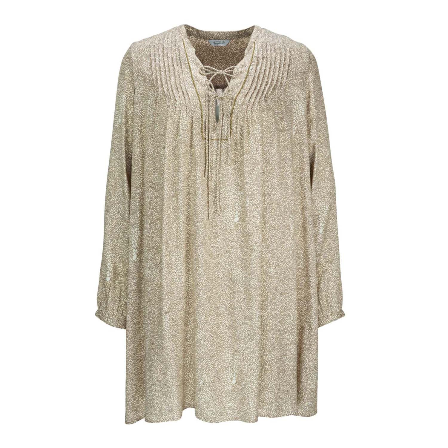 Blouse kleedje van Frogbox by Princess. Deze jurk heeft een witte basis met een bruine print in de vorm van onregelmatige ronde steentjes. De jurk heeft een rechte, losvallende pasvorm, plooitjes aan de schouders en een V-hals met koordjes.