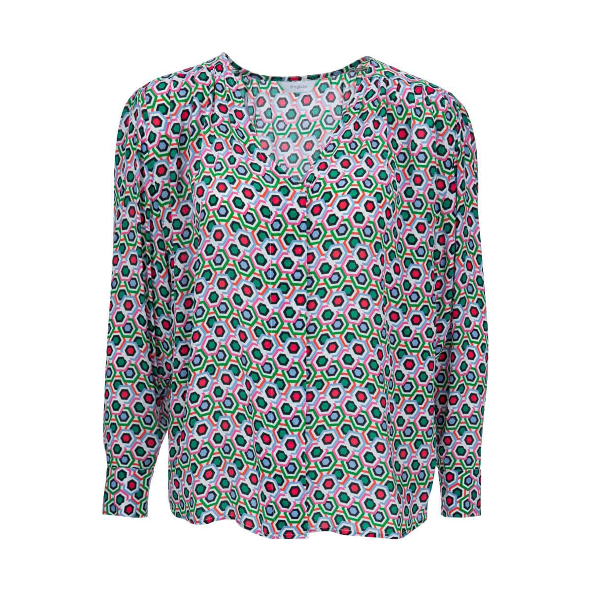 Losvallende blouse van Frogbox. Deze blouse heeft een all over print met hexagons in rood, blauw en groen en sluit met een verborgen knoopsluiting aan de voorzijde. De blouse heeft een V-hals en lange mouwen.