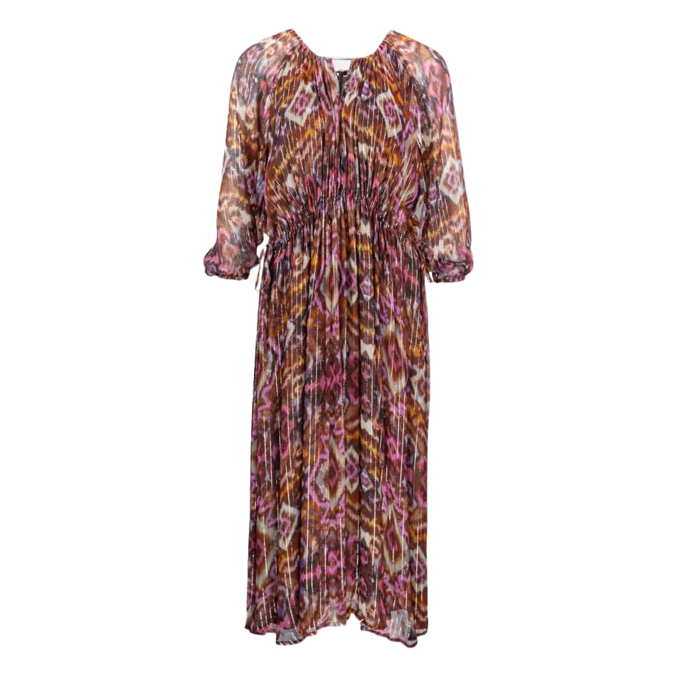 Los vallend kleedje van Frogbox goes Princess. Deze midi jurk is gemaakt van een stof met ikat print met fijne gouden lurex strepen die aan de lange mouwen doorschijnend is. De jurk heeft aan de voor- en achterzijde in de hals een V-insnede met een koordje dat je aan de achterzijde kunt strikken. De taille kan ook geaccentueerd worden met een trekkoord.