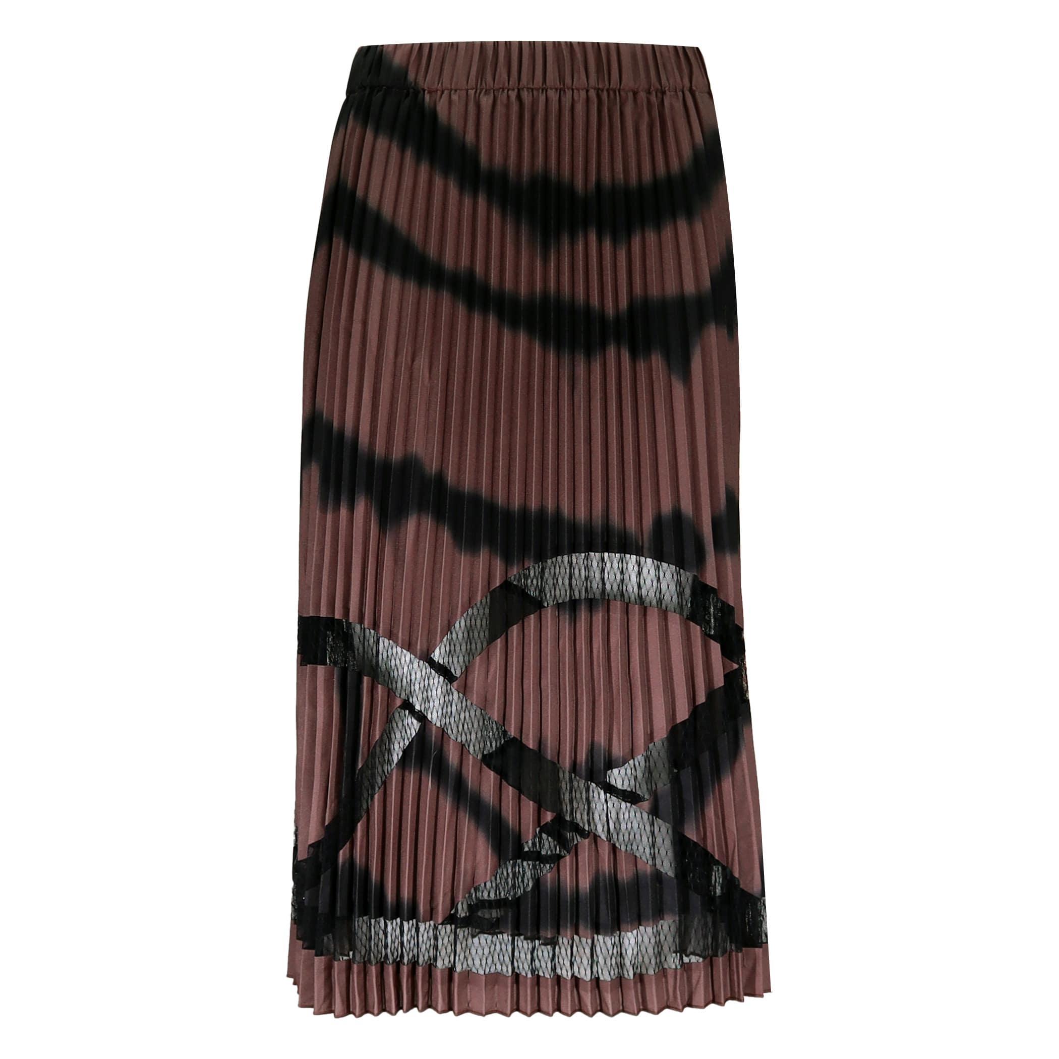 Bruine satijnen rok van Frogbox goes Princess. Deze midi rok is gemaakt van een gladde geplooide bruine stof met een zwarte batik print en zwart doorschijnend kant. De plissé rok heeft een elastische taille en valt op de kuiten.