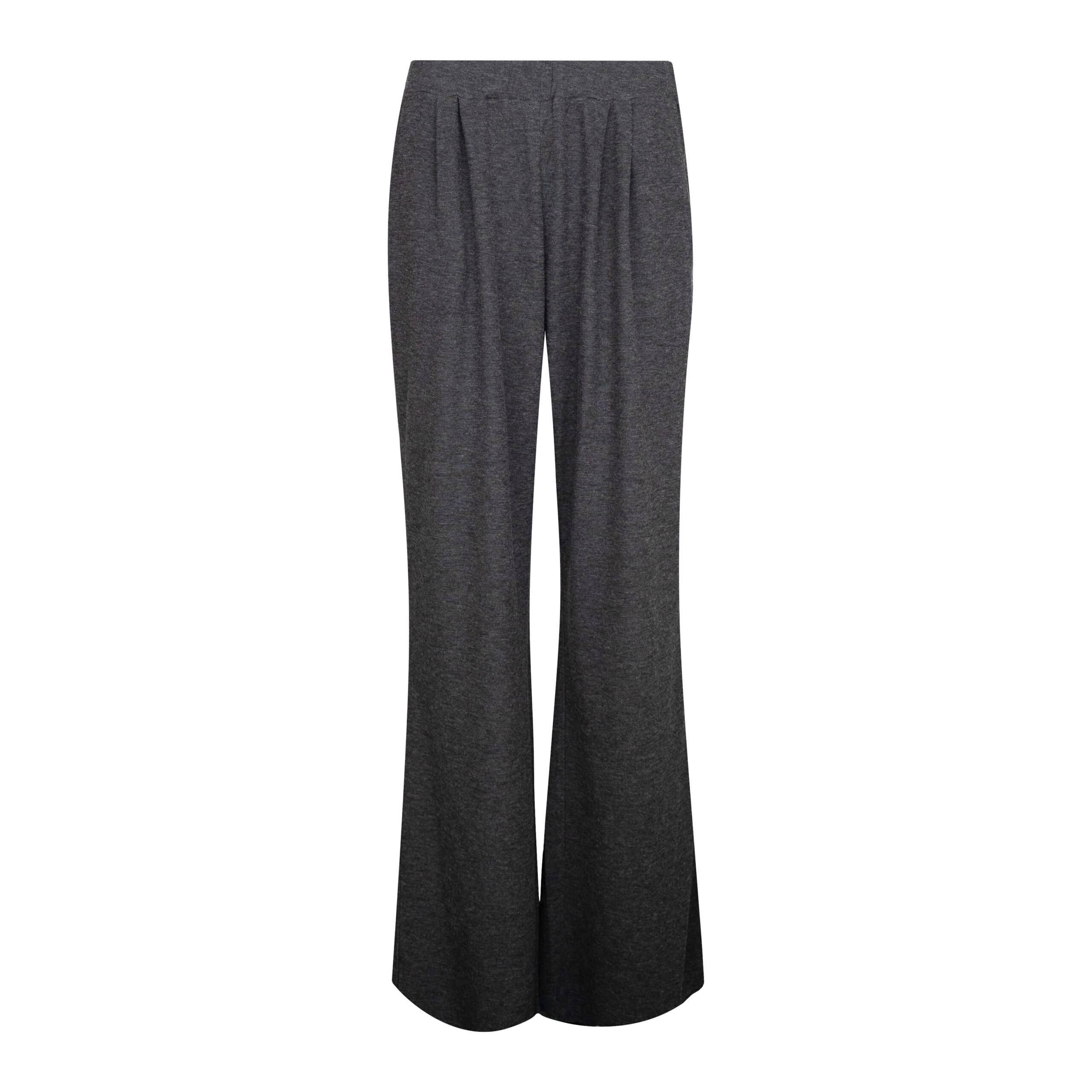 Losvallende pantalon van Frogbox goes Princess, model wide leg pants in wool mix. Deze broek is gemaakt van een dunnere, soepel vallende donkergrijze stretch stof waar wol in verwerkt is en heeft een geplooide tailleband. De broek heeft een elastische taille, twee steekzakken, relaxte pasvorm met flared broekspijpen.