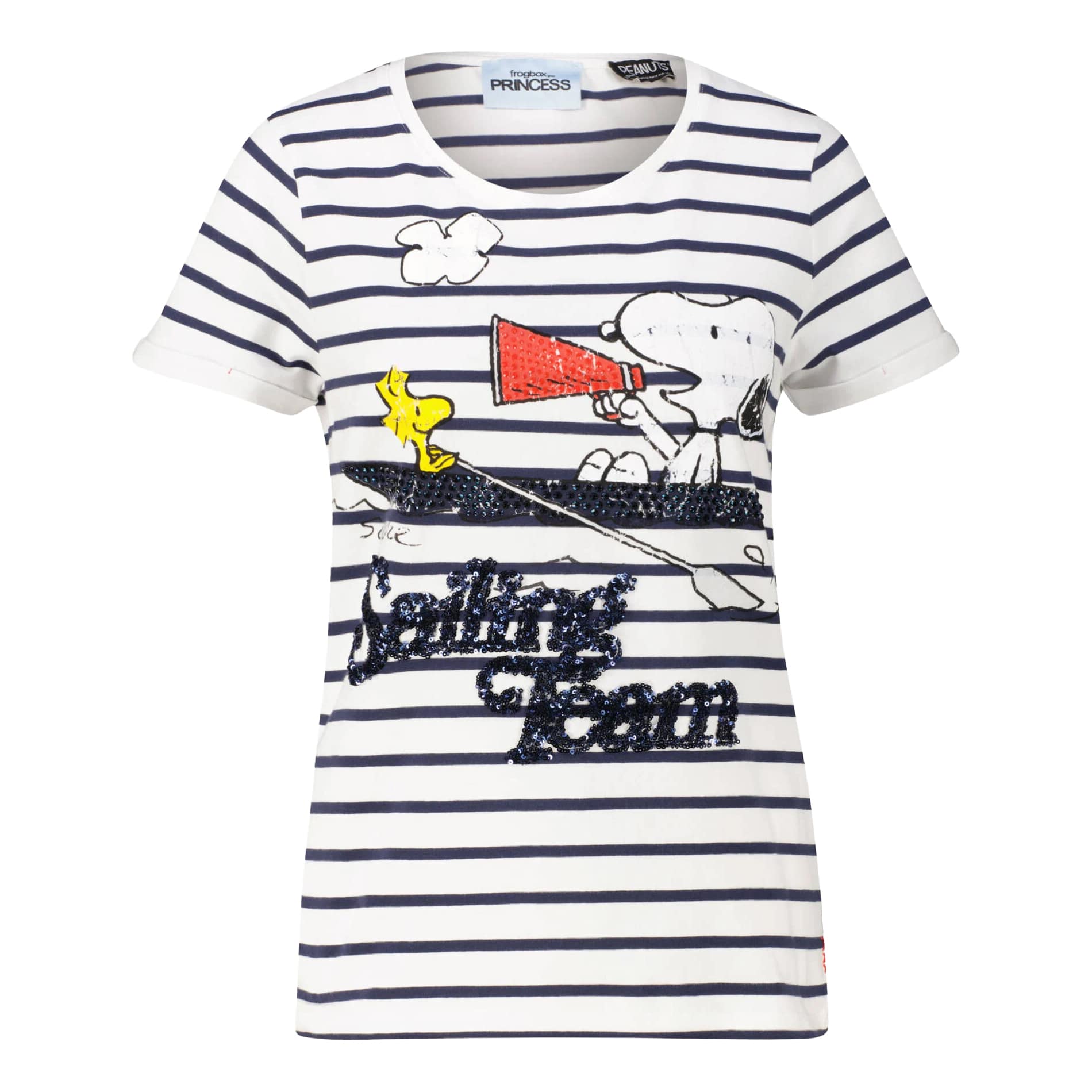 Gestreept t-shirt van Frogbox goes Princess, model t-shirt Snoopy sailing team in clear white. Dit t-shirt heeft op de voorzijde een afbeelding van Snoopy en Woodstock in een boot dat bezet is met kleine steentjes. De woorden sailing team bestaan uit pailletten. Het t-shirt heeft een normale pasvorm, ronde hals en korte mouwen.