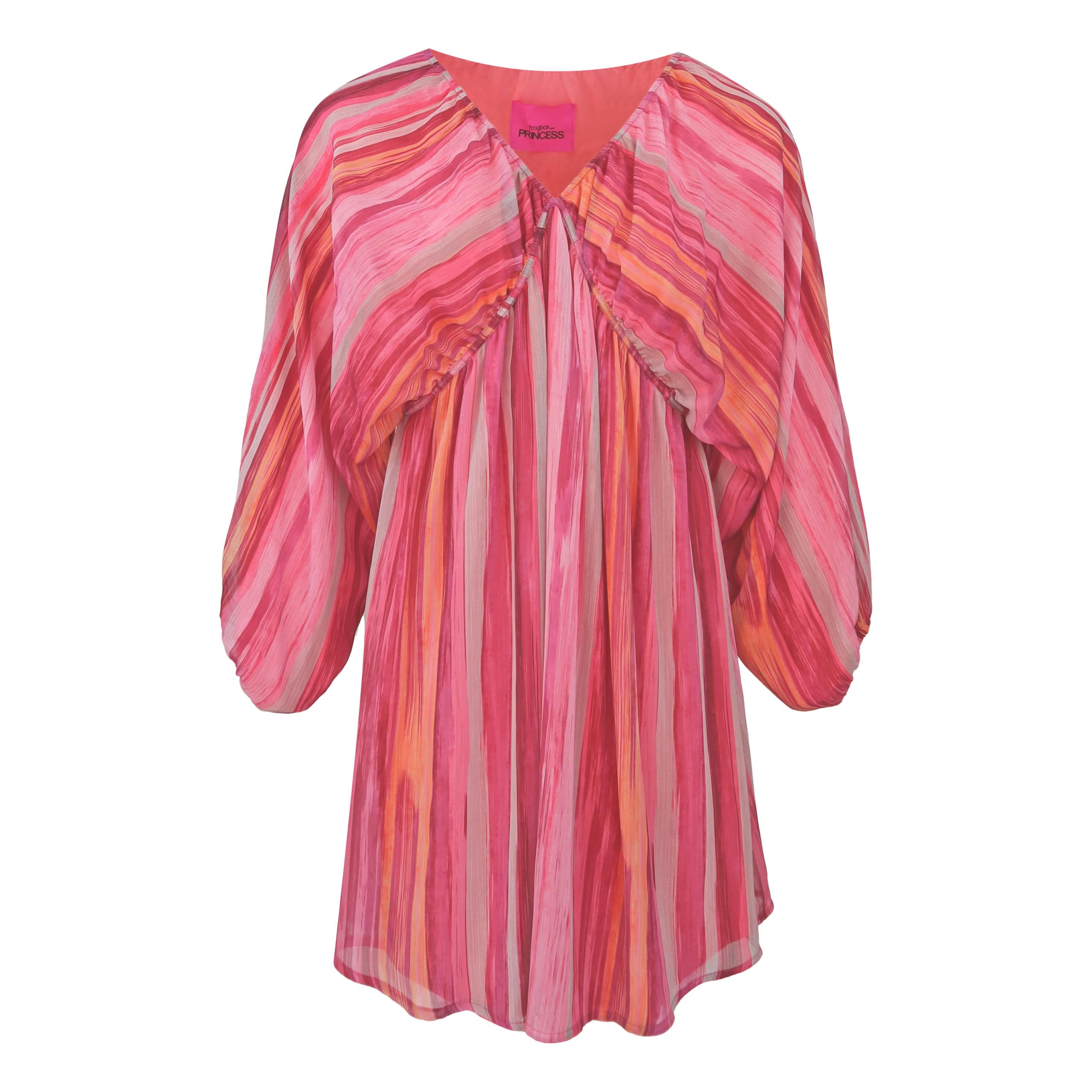 Roze gestreept kleedje van Frogbox by Princess. Deze mini jurk is gevoerd, heeft een roze gestreepte print, V-hals en losvallende pasvorm. De jurk heeft wijde lange mouwen met elastische manchetten en valt kort.