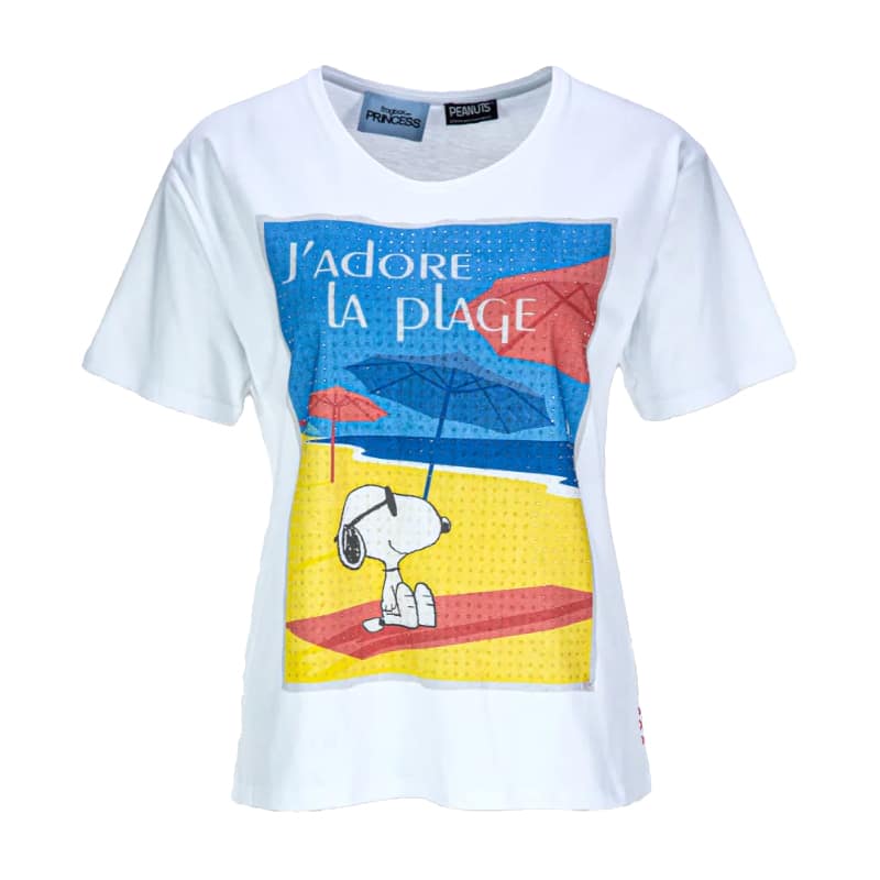 Wit t-shirt van Frogbox by Princess, model t-shirt Snoopy J’adore la plage in clear white. Dit t-shirt heeft op de voorzijde een afbeelding van Snoopy op het strand en de woorden J’adore la plage die versiert is met doorschijnende steentjes. Het t-shirt heeft een normale pasvorm, ronde hals en korte mouwen.
