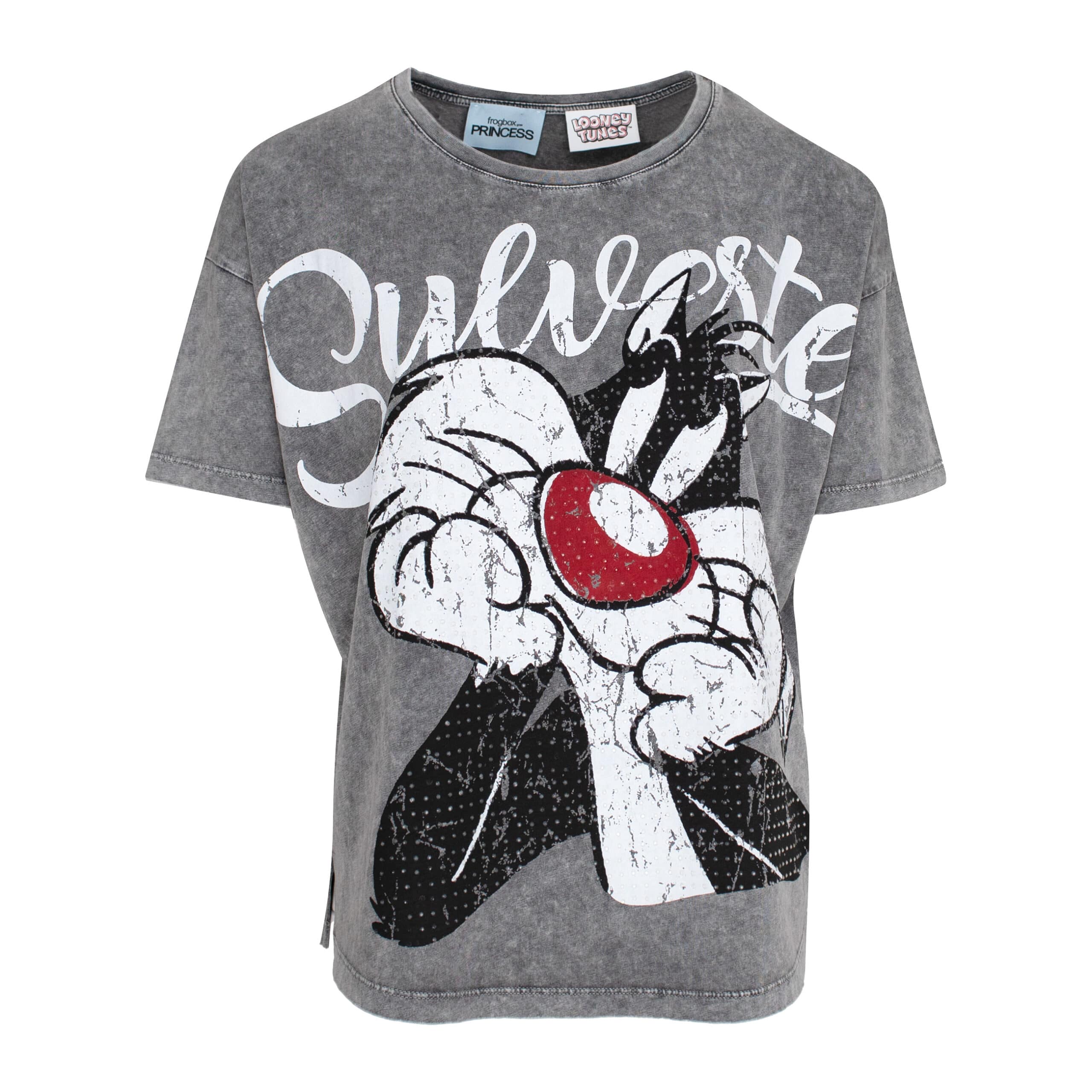 Grijs t-shirt van Frogbox goes Princess, model t-shirt Sylvester in montezuma. Dit t-shirt heeft op de voorzijde een afbeelding van Sylvester die bezet is met kleine doorschijnende steentjes. Het t-shirt heeft een losse pasvorm, ronde hals en korte mouwen.