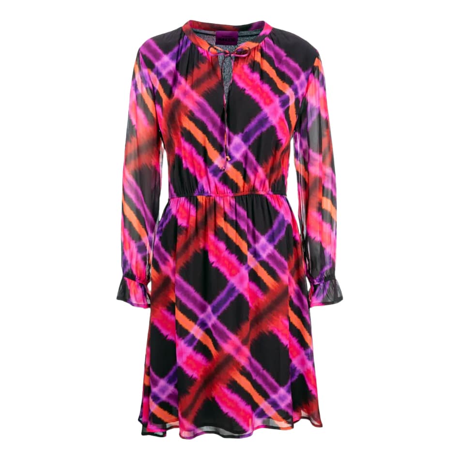 Kleurrijk kleedje van Frogbox by Princess, model checkered dress. Deze jurk heeft een zwart, roze, rode geruite print en heeft een elastische verhoogde taille. De insnede van de jurk kun je sluiten met twee koordjes. De jurk heeft lange mouwen en valt boven de knie.